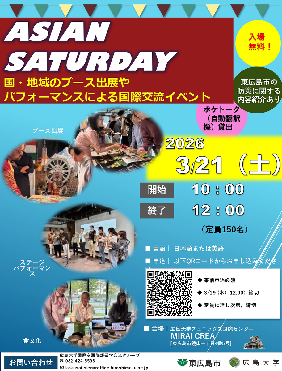 広島大学 国際室国際部 留学交流グループは3月21日(土)10時~12時、広島大学フェニックス国際センター MIRAI CREA(ミライ クリエ)で「国際交流イベント Asian Saturday」を開催します。