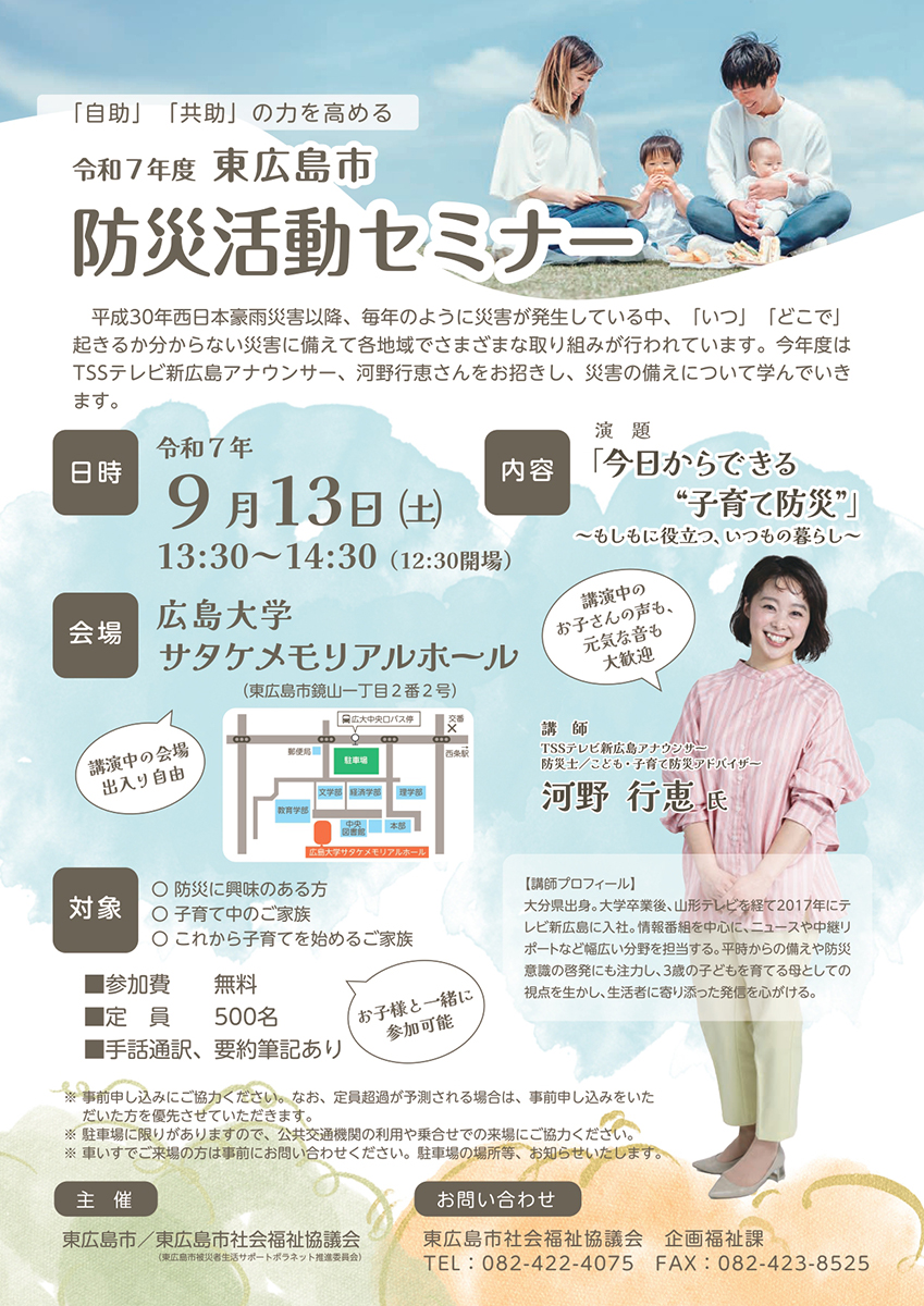 東広島市と東広島市社会福祉協議会(東広島市被災者生活サポートボラネット推進委員会)は9月13日(土)、広島大学サタケメモリアルホール(東広島市鏡山)で「令和7年度東広島市防災活動セミナー」を開催します。
