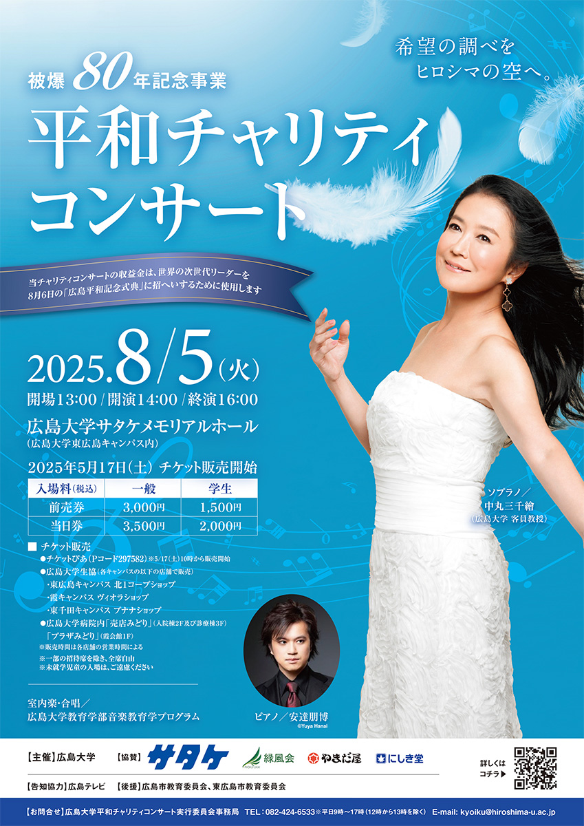 同コンサートは、平和への願いを胸に音楽を通じて過去を振り返り、未来に希望をつなげるイベントです。当日は、広島大学教育学部の客員教授であり世界的なオペラ歌手の中丸三千繪氏、ピアニストの安達朋博氏が出演。教育学部第四類音楽教育学プログラムの教員・学生・卒業生も合唱や演奏を披露します。音楽が持つ癒やしと力強さを感じながら、来場者の皆さまと平和の大切さを分かち合うひとときをつくりたいと考えています。チケット販売による収益は、広島市が8月6日に主催する「広島平和記念式典」に、世界の次世代リーダーを招へいするために使用します。