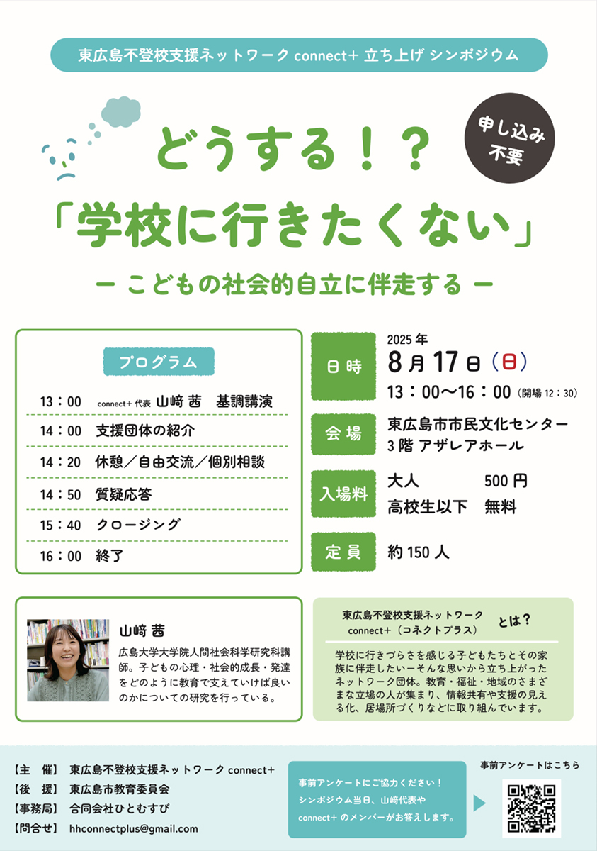東広島不登校支援ネットワーク connect+(コネクトプラス)は8月17日(日)13時〜16時、東広島市市民文化センター3階アザレアホールで、立ち上げシンポジウム『どうする!? 「学校に行きたくない」―こどもの社会的自立に伴走する―』を開催します。