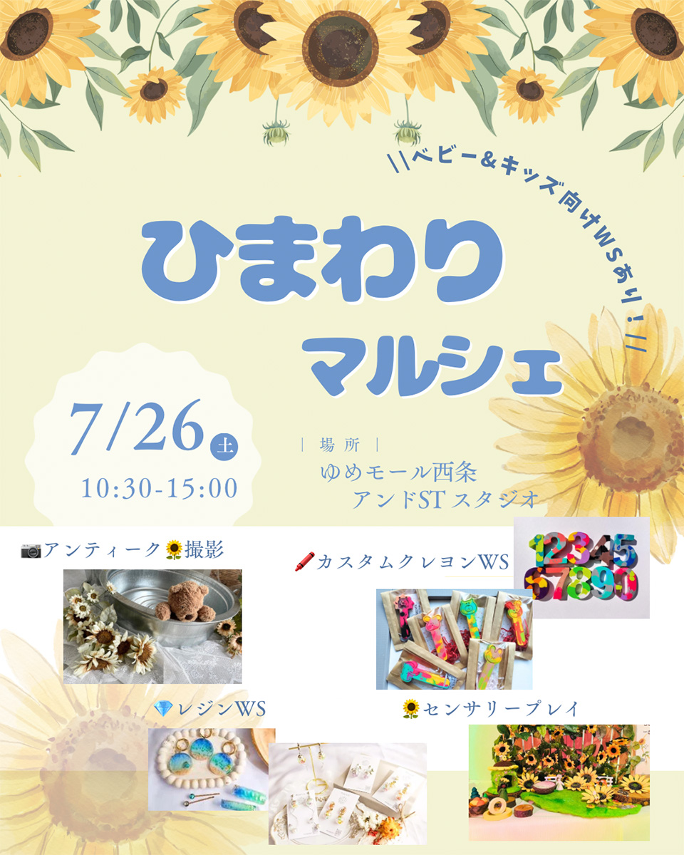 同マルシェでは、涼しい室内で楽しめるベビーやキッズが対象のワークショップや撮影会などを実施予定。オリジナルクレヨンが作れるカスタムクレヨンワークショップ、レジンワークショップやレジンアクセサリーの販売、アンティークひまわりフォトブース撮影を行います。ひまわりのセンサリープレイで五感を刺激する感覚遊びも体験できます。ワークショップは事前予約可能。当日参加も歓迎。
