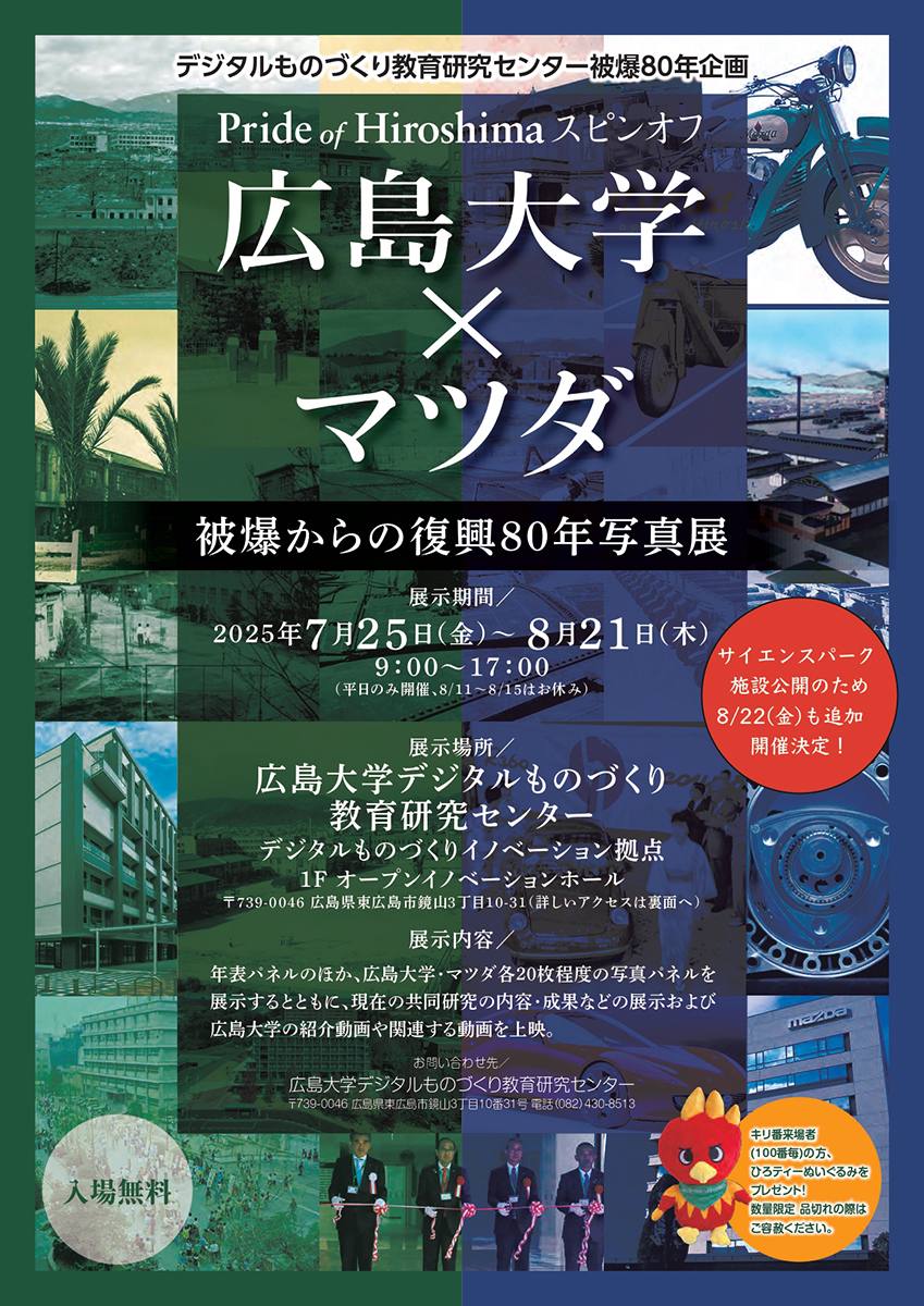 広島大学デジタルものづくり教育研究センターは7月25日~8月22日、同センター1階のオープンイノベーションホールで「Pride of Hiroshimaスピンオフ 広島大学×マツダ 被爆からの復興80年写真展」を開催します。