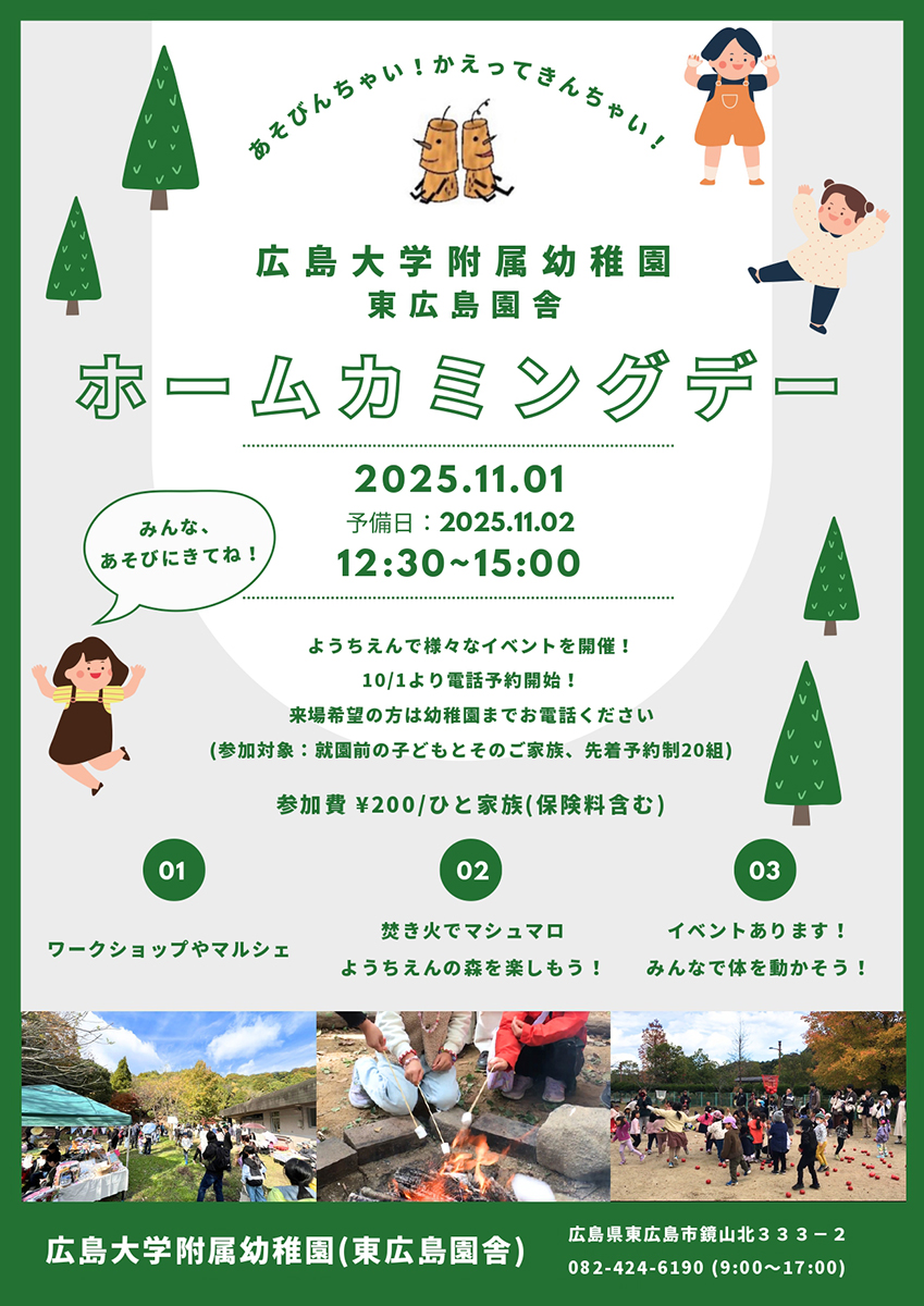広島大学附属幼稚園(同窓会・後援会)ゆうゆうの会は11月1日(土)12時30分~15時に広島大学附属幼稚園(東広島園舎)で「あそびんちゃい!かえってきんちゃい!ホームカミングデー」を開催します。