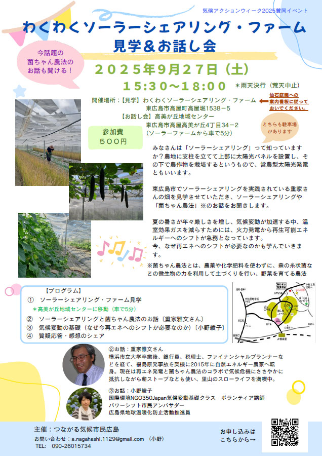 市民団体のつながる気候市民広島は9月27日(土)、気候アクションウィーク2025賛同イベントの「わくわくソーラーシェアリング・ファーム 見学&お話し会」を開催します。