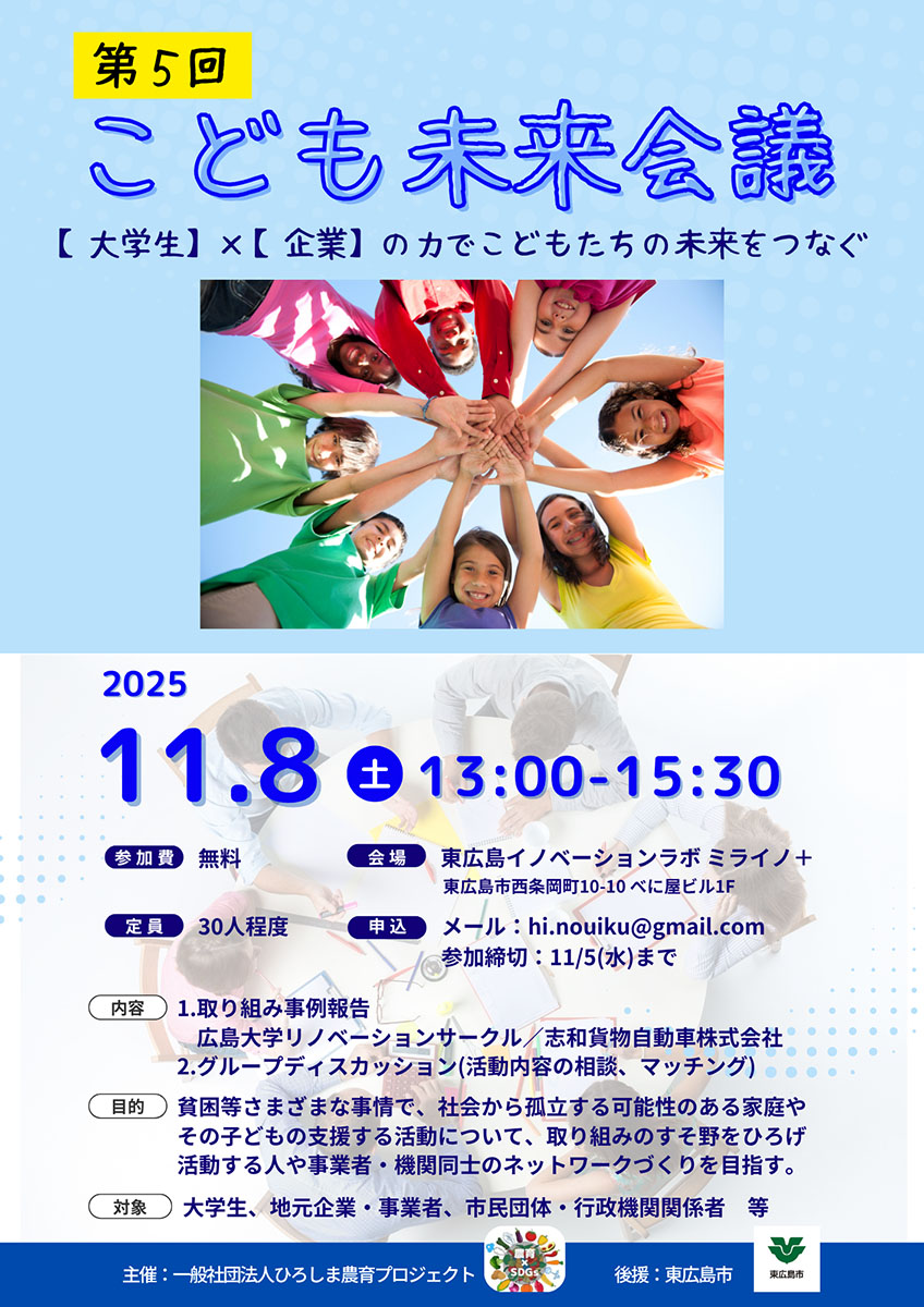 一般社団法人ひろしま農育プロジェクト・株式会社スリストム広島は11月8日(土)13時~15時30分、東広島イノベーションラボミライノ⁺で「第5回こども未来会議~【大学生】&【企業】の力で子供達の未来をつなぐ~」を開催します。