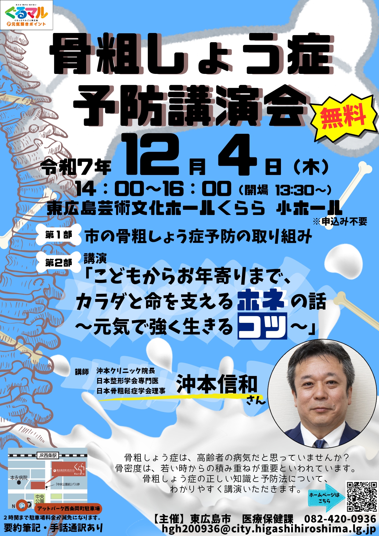 第1部では、市が進める骨粗しょう症予防の取り組みを紹介。第2部では、沖本クリニック院長の沖本信和さんを講師に迎え「こどもからお年寄りまで、カラダと命を支えるホネの話 ~元気で強く生きるコツ~」をテーマに講演を行います。