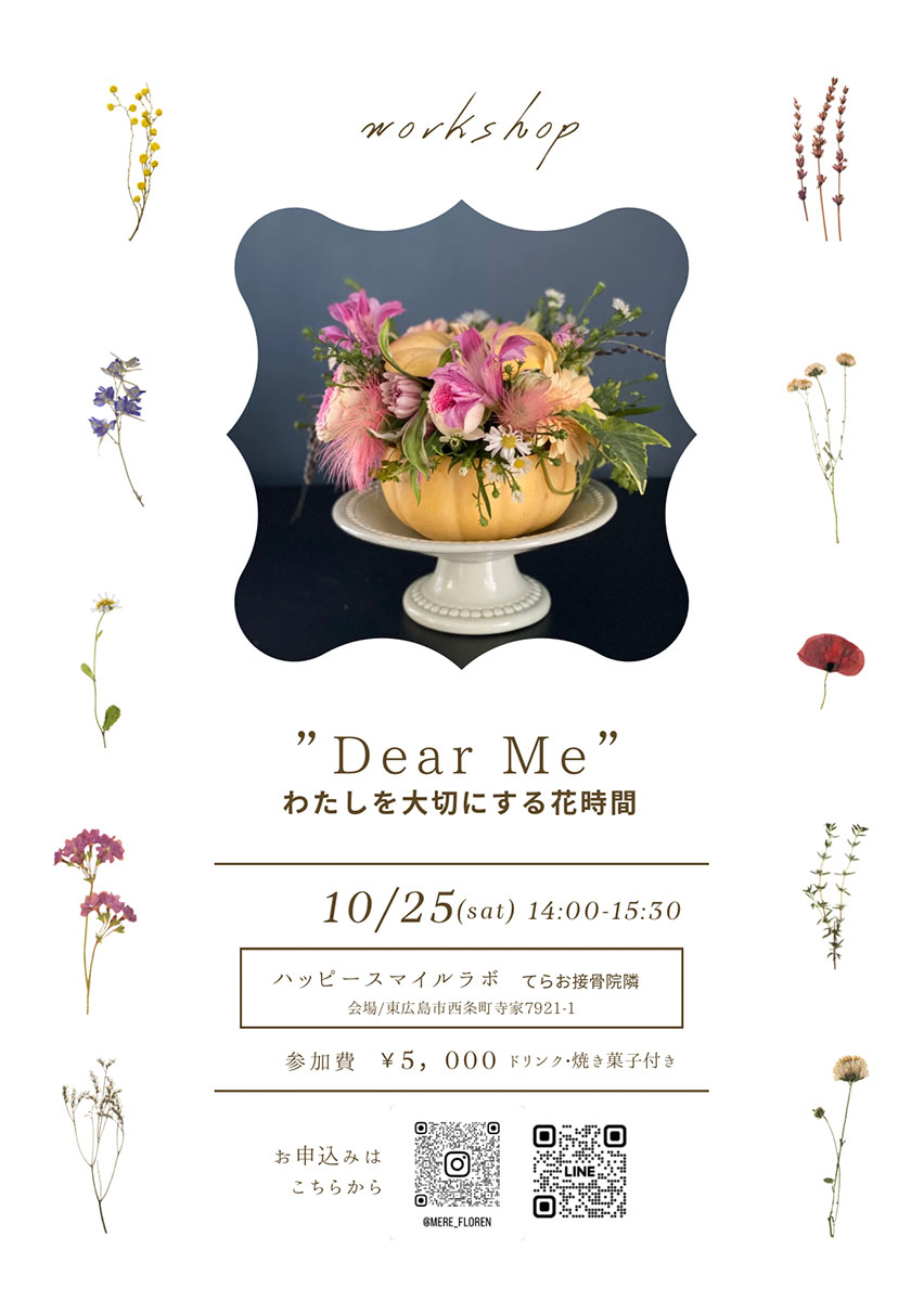 会場はハッピースマイルラボ(東広島市西条町寺家7921-1)。参加費5000円。ドリンク・焼き菓子付き。定員4人。申し込みはMère Floren メア フローレンのInstagramから。