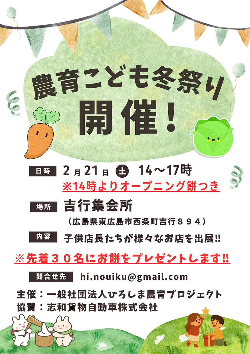 一般社団法人ひろしま農育プロジェクトは2月21日14時~17時、東広島市西条町の吉行集会所で「農育こども冬祭り」を開催します。志和貨物自動車株式会社が協賛。