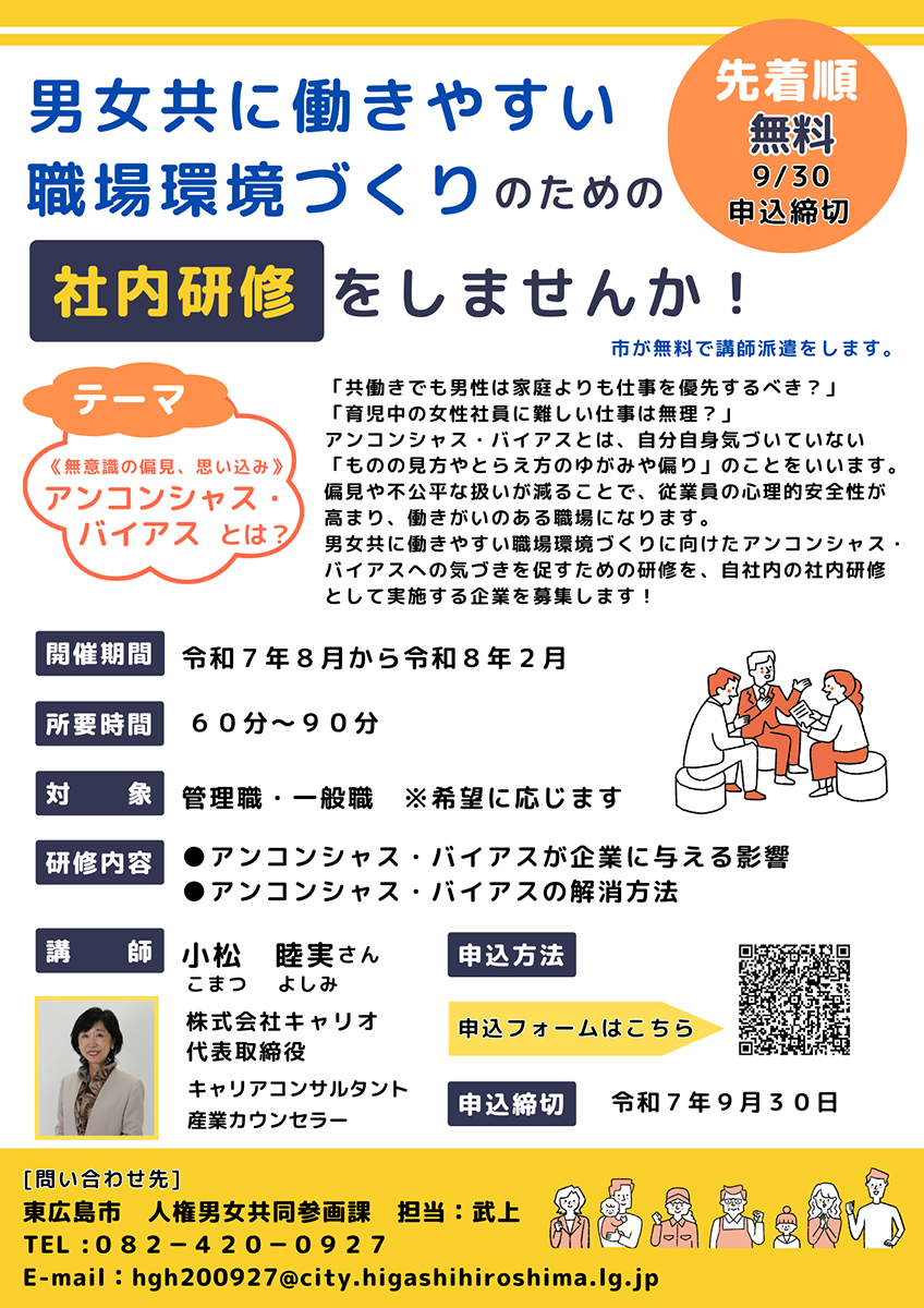 東広島市人権男女共同参画課は、男女ともに働きやすい職場環境づくりを進めるため、アンコンシャス・バイアスに関する自社内の社内研修を実施する企業を募集しています。