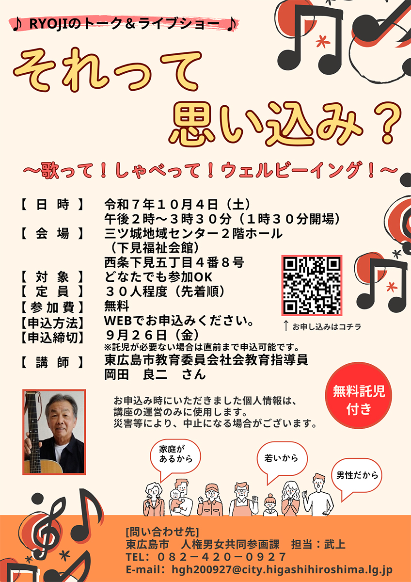 東広島市人権男女共同参画課は10月4日(土)、三ツ城地域センター2階ホール(下見福祉会館)で「♪RYOJIのトーク&ライブショー♪それって思い込み?~歌って!しゃべって!ウェルビーイング!~」を開催します。
