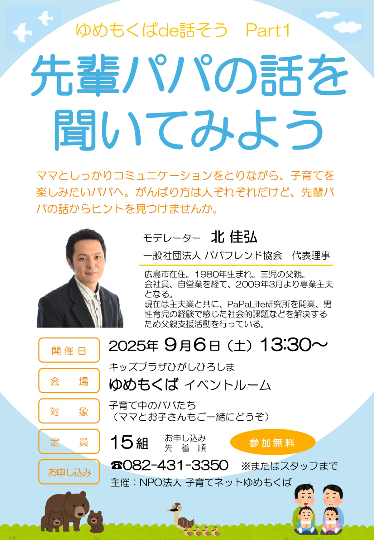NPO法人子育てネットゆめもくばは9月6日(土)13時30分から、キッズプラザひがしひろしま ゆめもくばイベントルームで「先輩パパの話を聞いてみよう」を開催します。