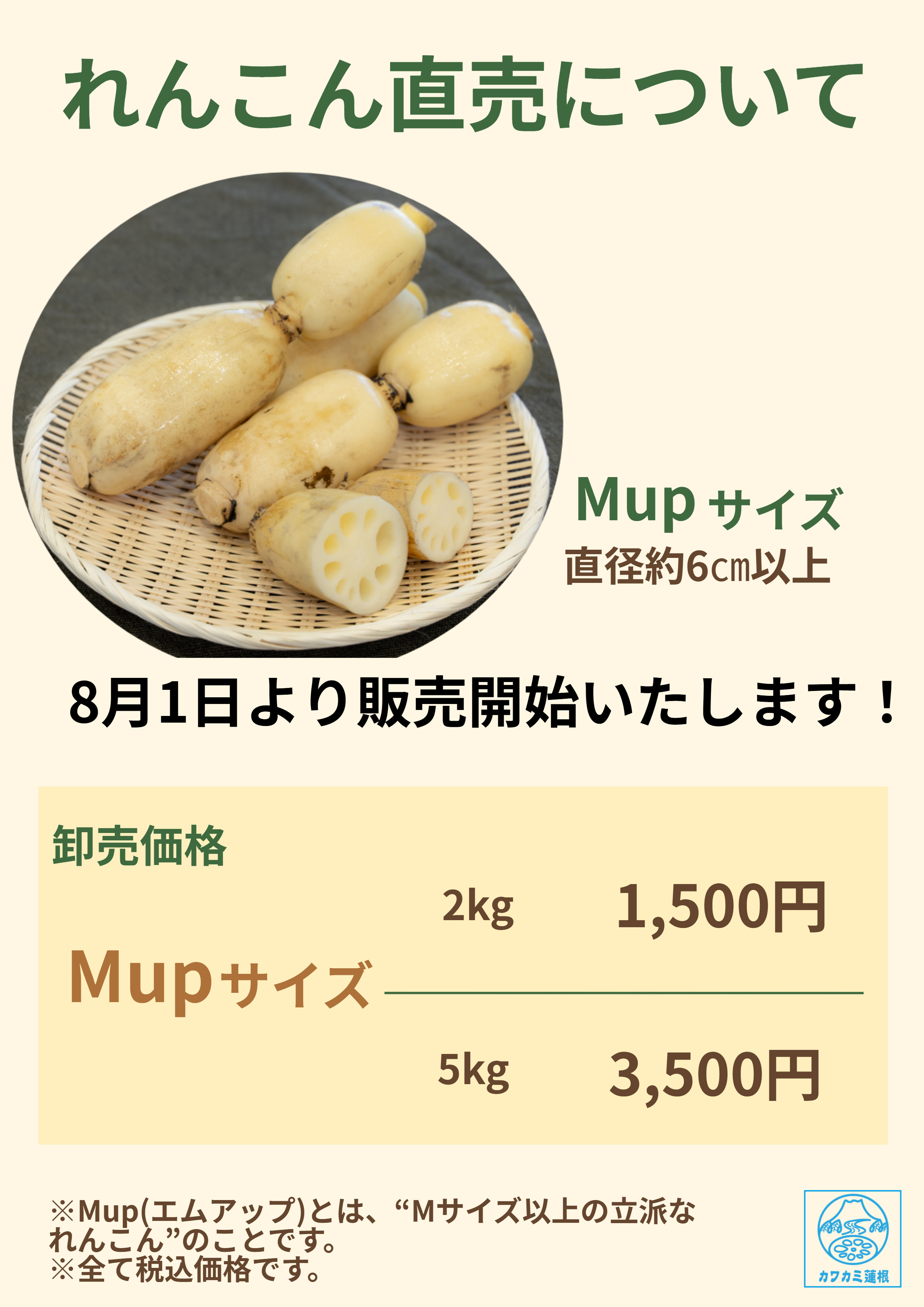 販売されるのは、直径約6センチ以上の「Mup(エムアップ)」サイズのレンコン。2キロ単位での販売で、買い求めやすさとボリュームを兼ね備えています。
