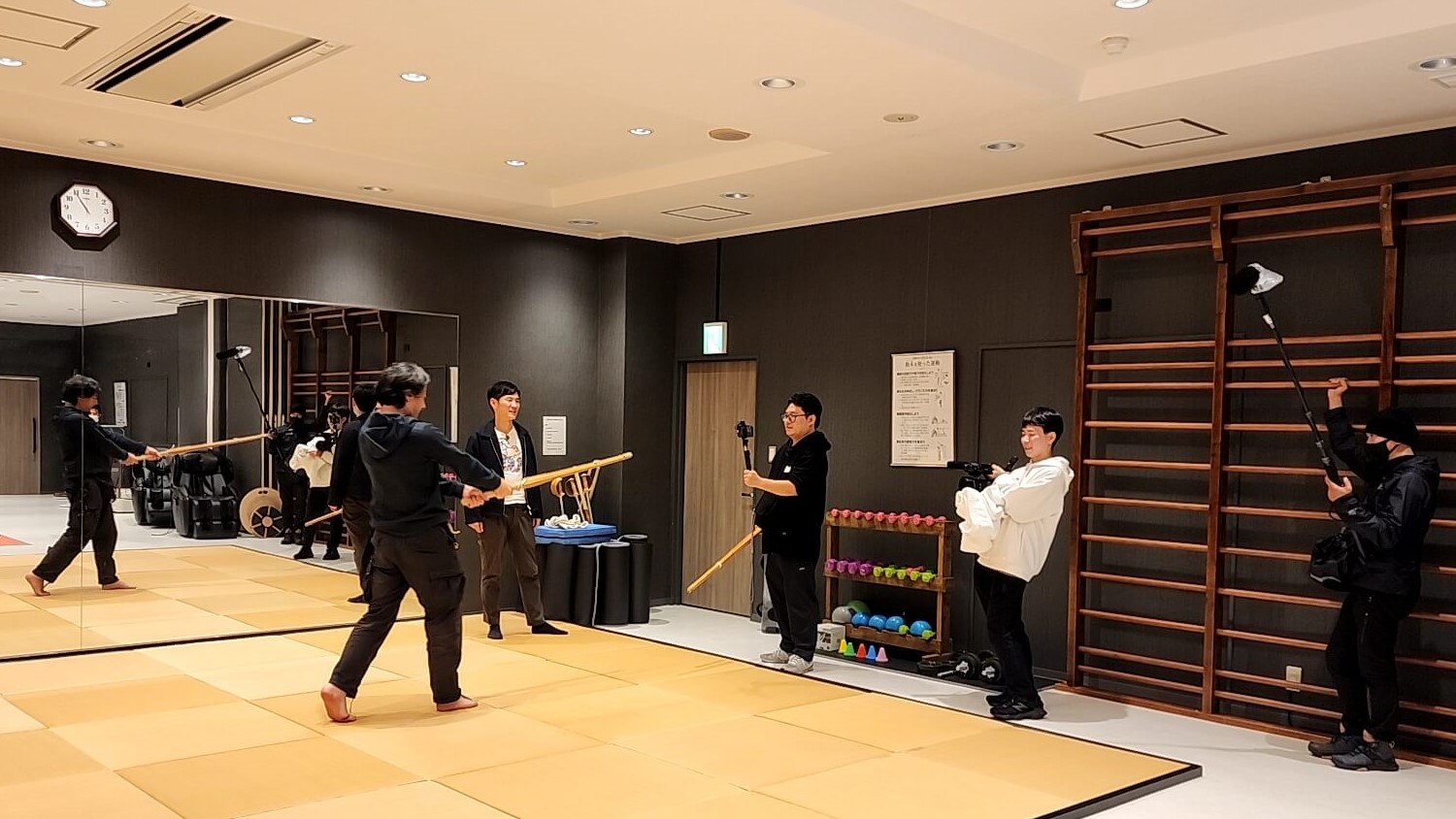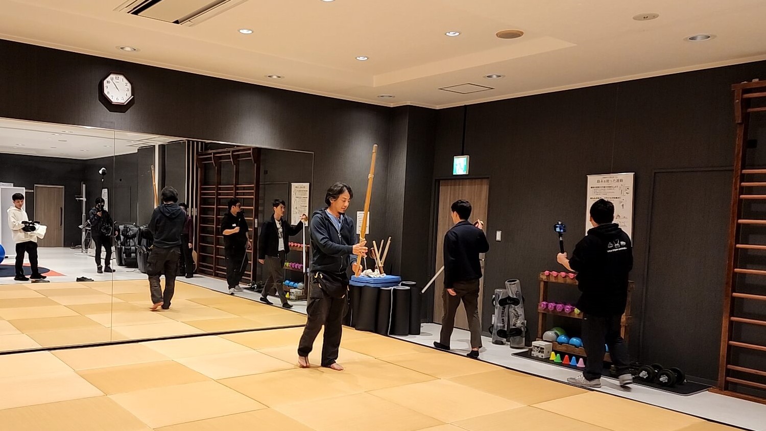 竹刀を見つけて素振りをするひろゆきさん。