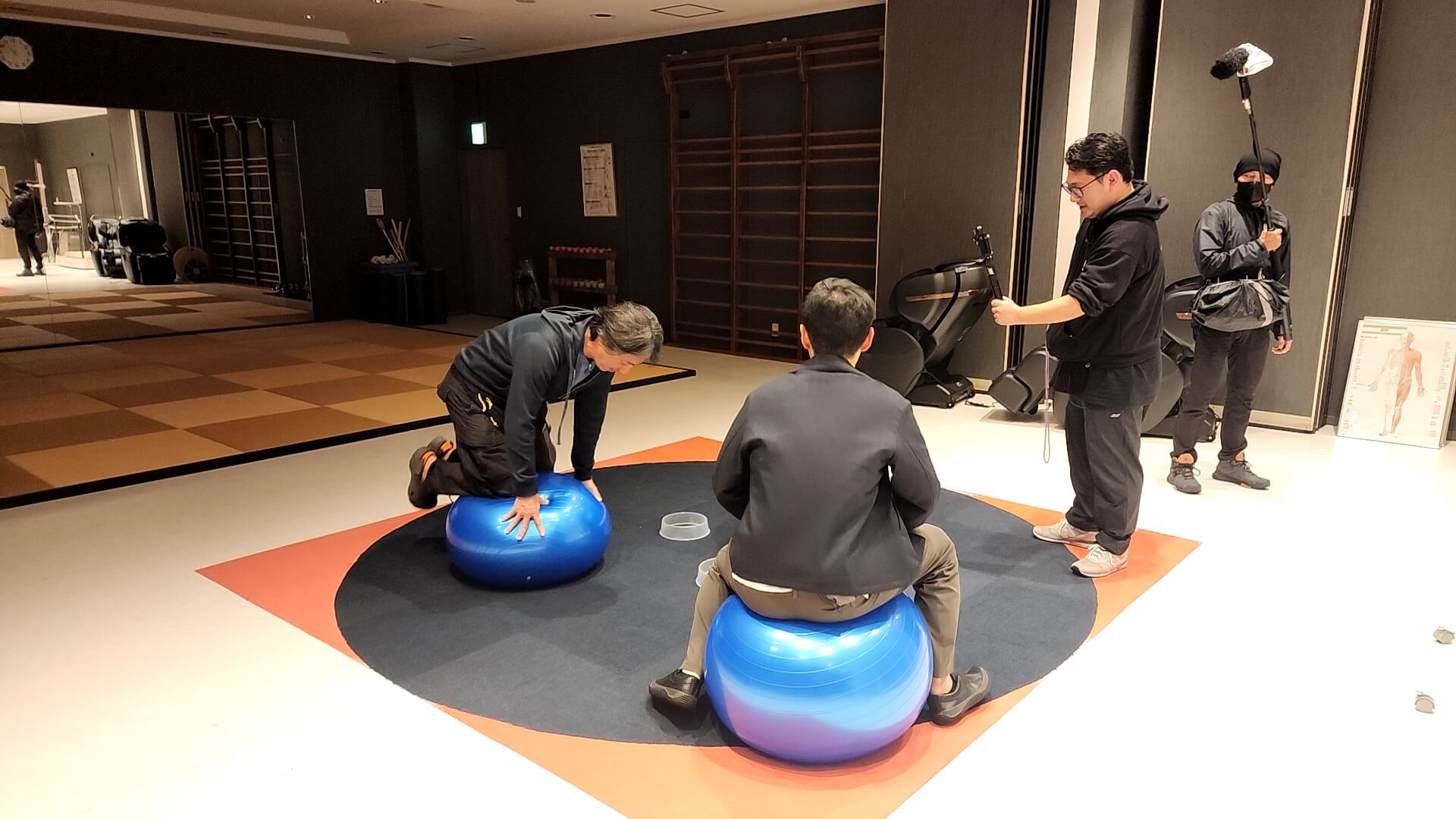 バランスボールではしゃぐReHacQご一行。正座をを試みるひろゆきさん。