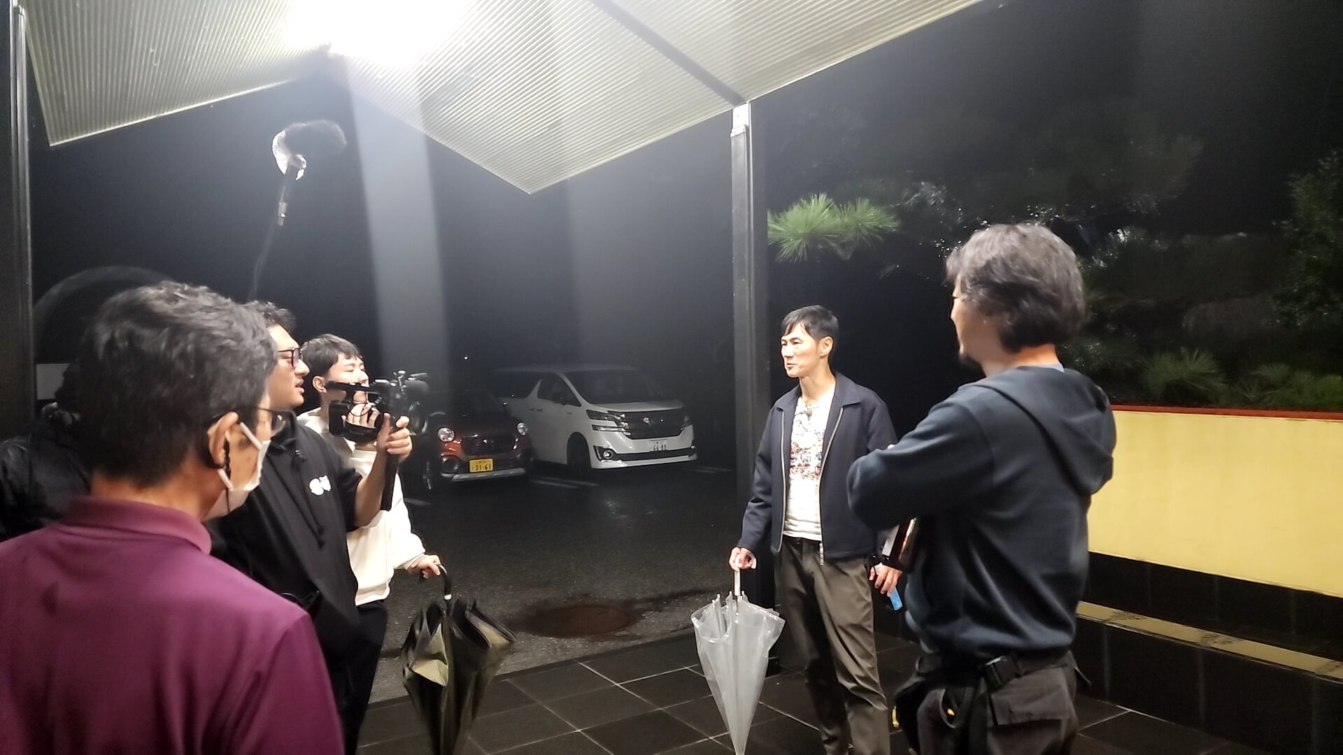 小さな入口の前で入る人のために傘を差す石丸さん。常々気配りのできる素敵な人です。