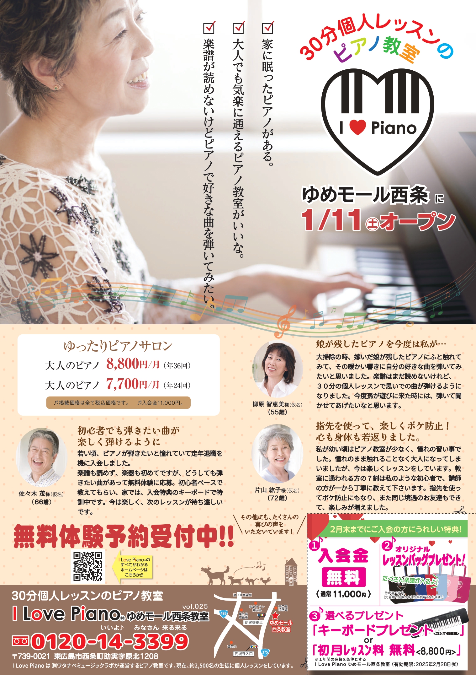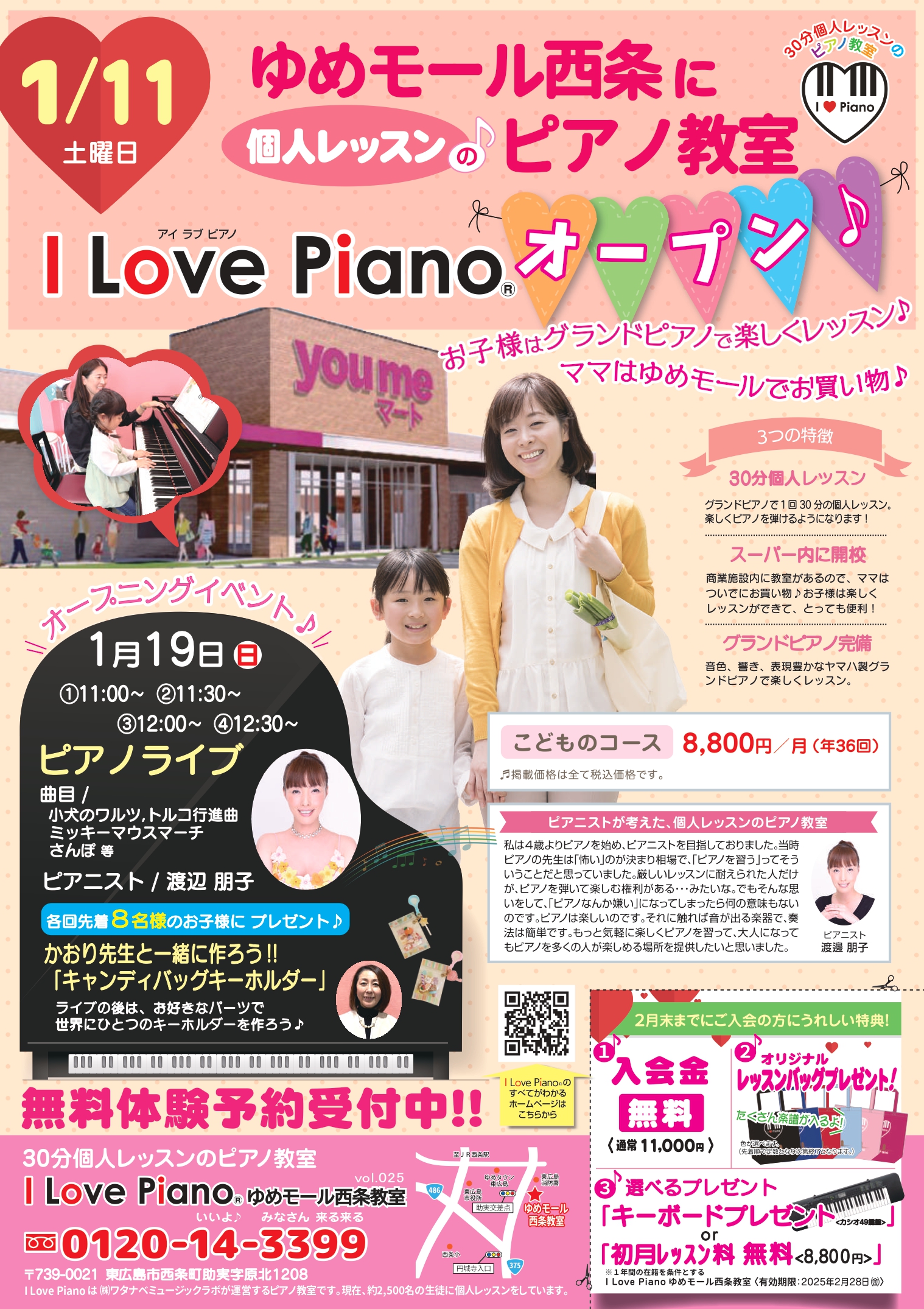 ゆめモール西条に、「30分個人レッスンのピアノ教室 I Love Piano 」が1月11日にオープン。ワタナベミュージックラボ(本社・三原市)が運営する教室で、西日本で21店舗目。