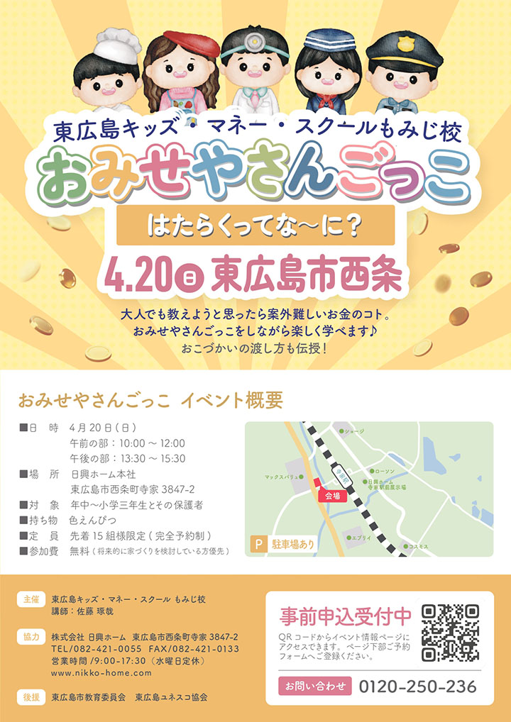日興ホームは4月20日、東広島市西条町寺家の本社で、東広島キッズ・マネー・スクールもみじ校とのイベント「おみせやさんごっこ~はたらくってなに?~」を開催します。午前の部は10時~12時、午後の部は13時30分~15時30分。