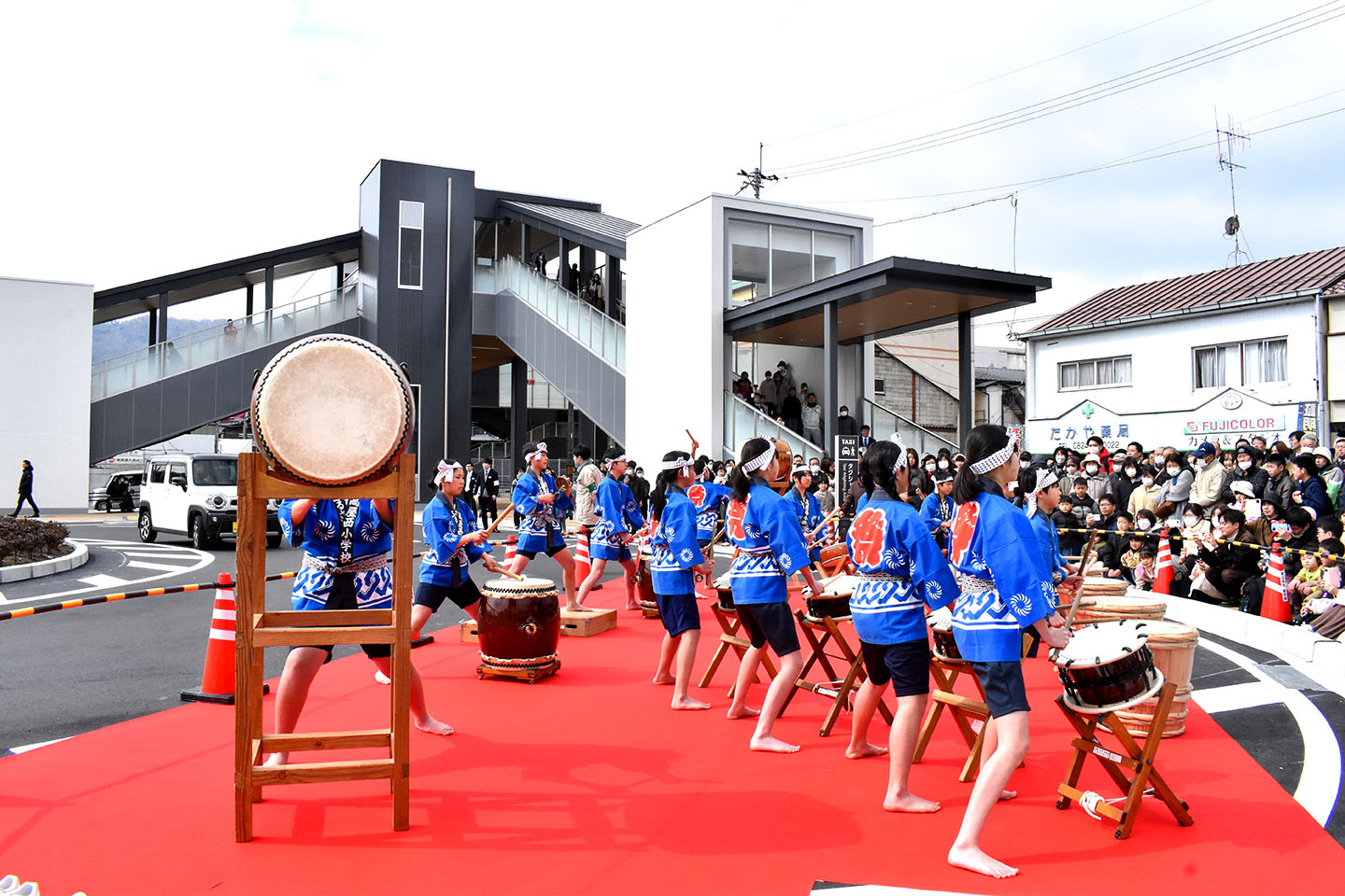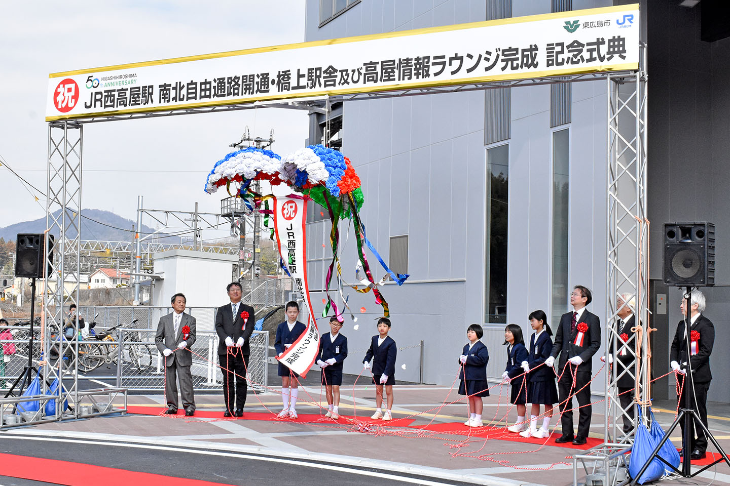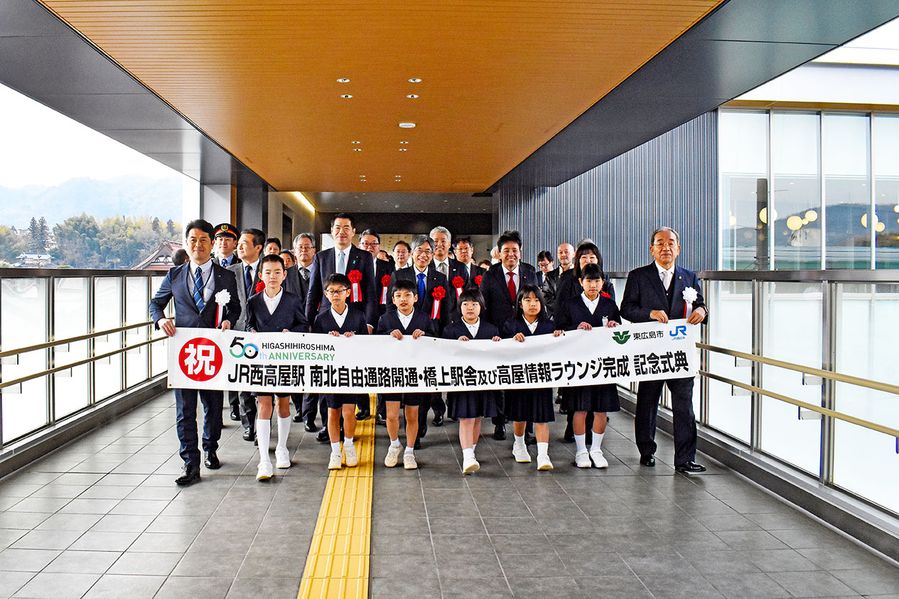 JR西高屋駅の南北自由通路と橋上駅舎が3月21日から供用開始となり、記念式典が20日に行われました。式典は東広島市と西日本の共催で、高屋中学校生徒による演奏や、高屋西小学校の児童たちによる渡り初めをし、完成を祝いました。