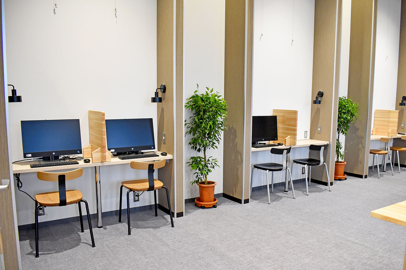 交流センターは、テーブルや椅子、モニターやホワイトボードが備わった空間。ミーティングなどに活用したり、待合スペースとして利用したりできます。
