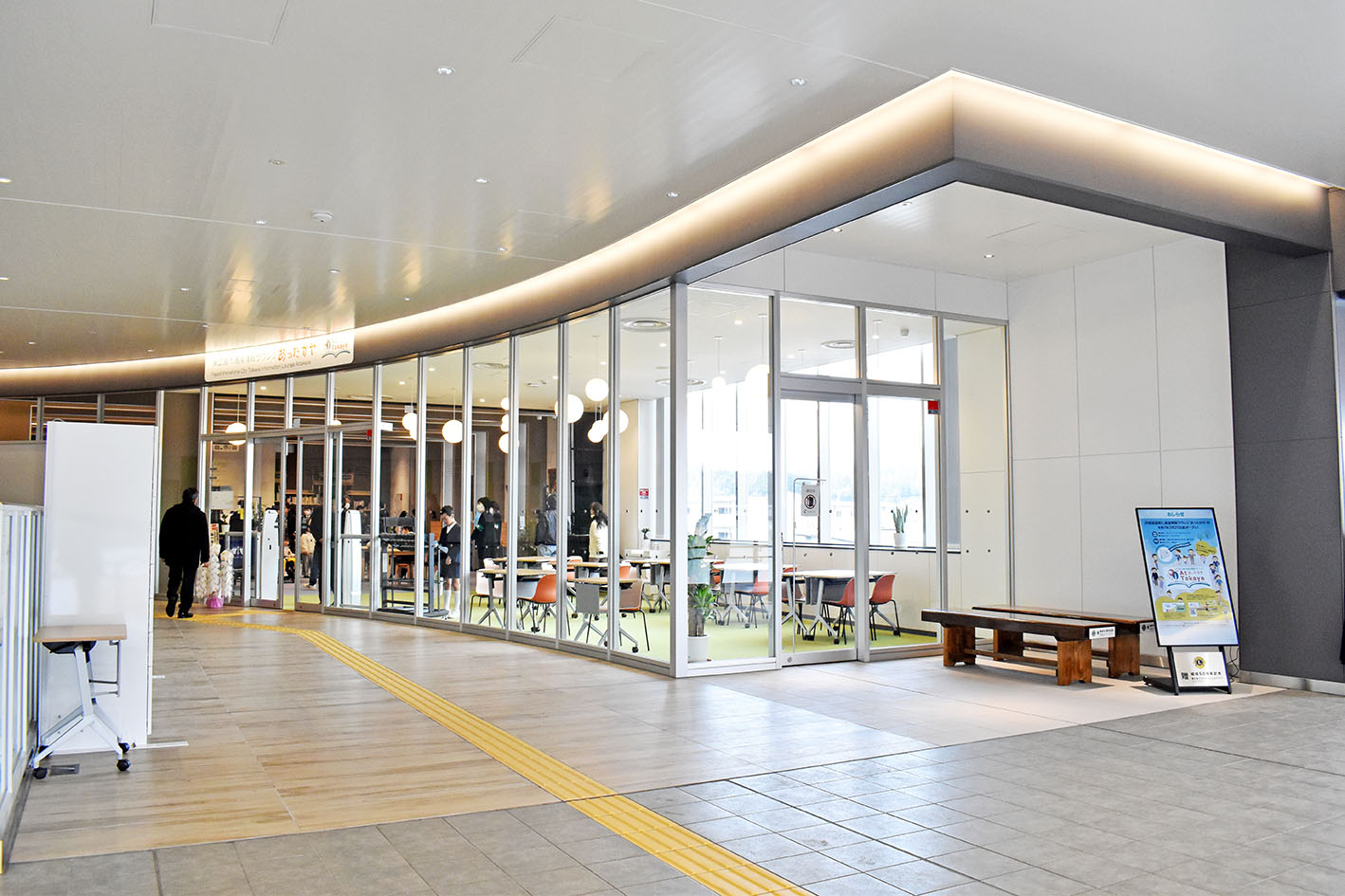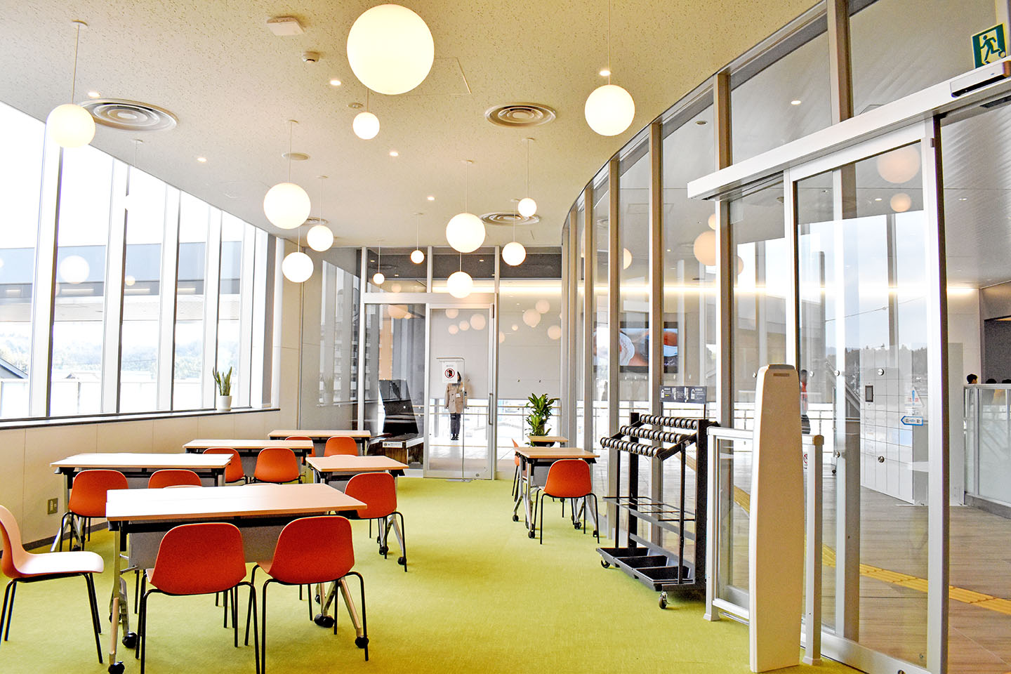 橋上駅舎には、南北自由通路に併設する「高屋情報ラウンジ あったかや」をオープン。ラウンジ内手前が交流センター、奥に高屋図書館があります。西高屋駅は中高校生、大学生が多く利用しており、内装や備品の制作には駅周辺の学生も携わっています。