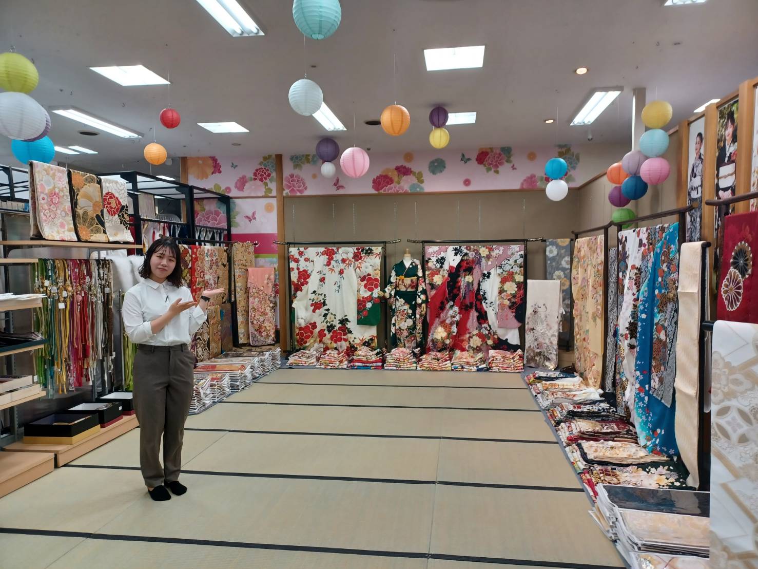 新作振り袖を多数入荷し、未仕立て衣装が100着以上、選べる小物は500点以上を取りそろえ。