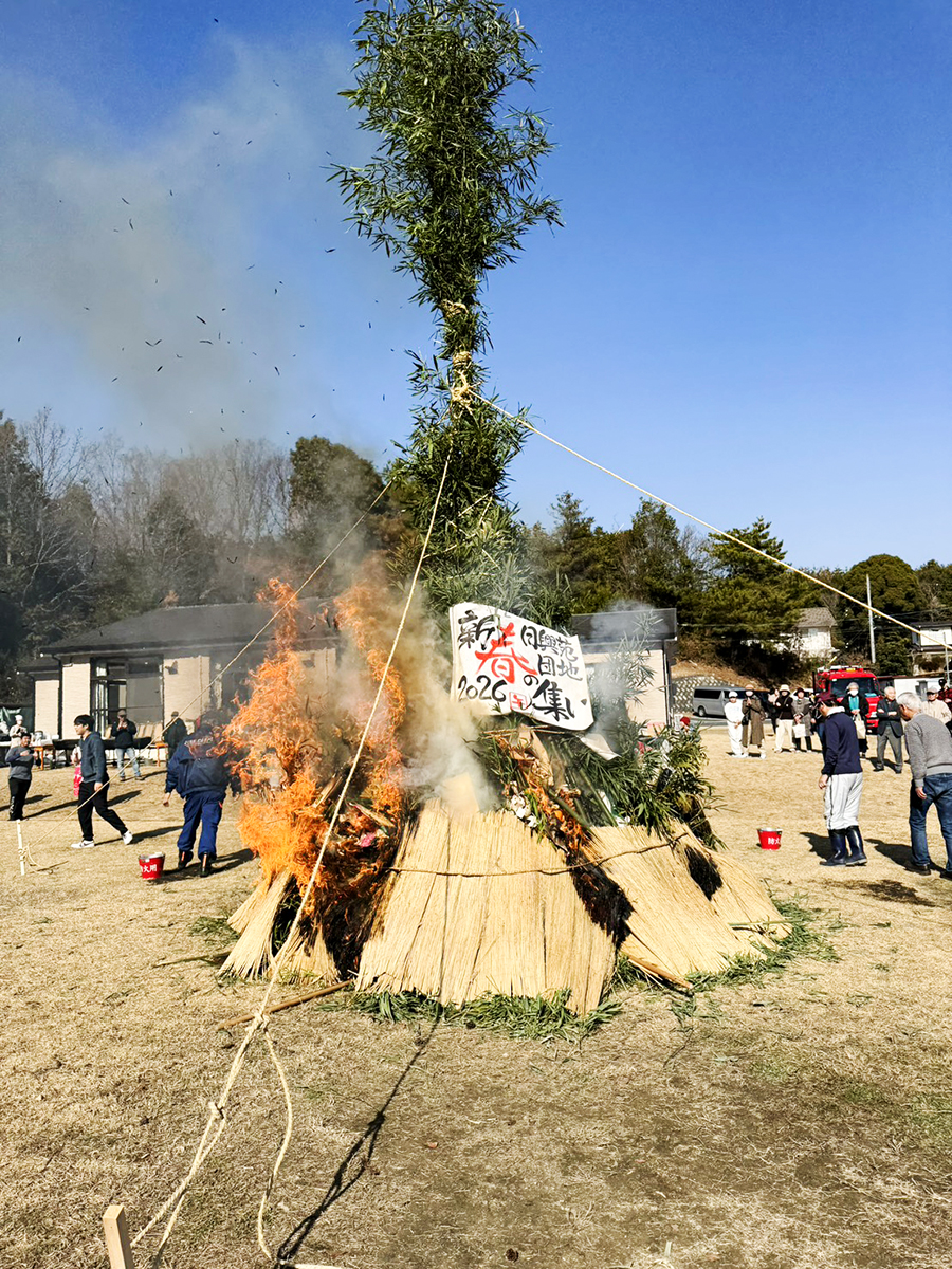 会場では、地域住民が切り出した竹を使ってやぐらを組み立て、とんどを実施。年男・年女7人が点火すると、高さ7メートルのやぐらが勢いよく燃え上がり、参加者は笑顔で無病息災や家内安全を願いました。