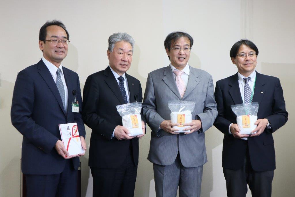 武林会長は「コメカラが誕生して約12年が経った。給食の定番メニューとしていただいたこともあり、ご当地グルメとして根付きつつあると感じる。これからも多くの子どもたち、地域の方々に召し上がっていただきたい」と思いを語り、市場教育長は「コメカラは子どもたちの大好きなメニューの一つであり、喜んで食べる様子が目に浮かぶ。今回寄贈いただいた米粉も大切に使用させていただく」と話していました。
