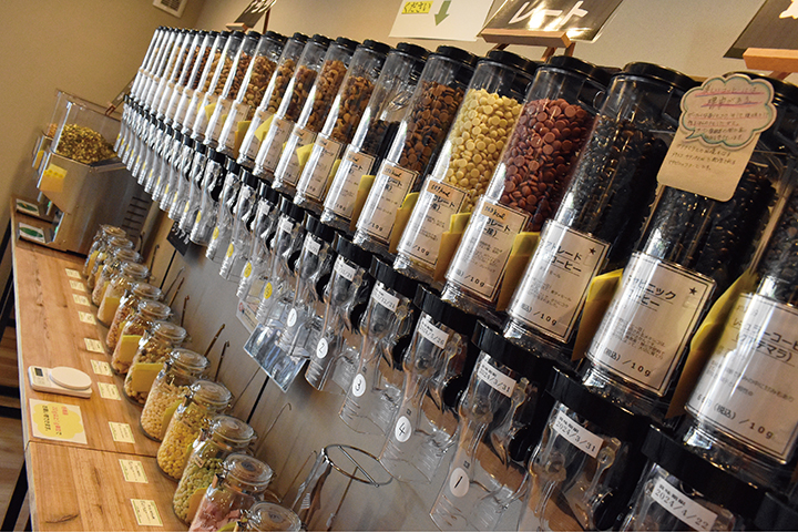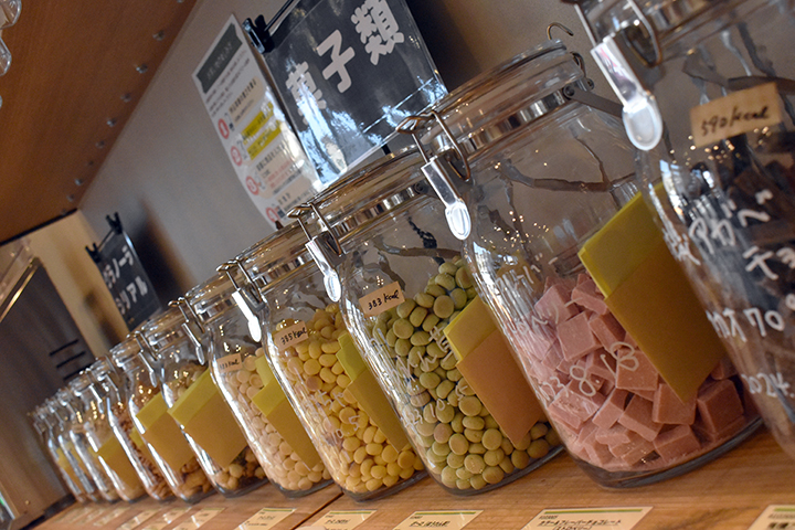 ナッツやドライフルーツ、オリーブオイル、醤油・塩などの調味料、乾物・粉類の他、チョコレートなどの菓子類、有機ふりかけなど様々な商品が瓶やディスペンサーで陳列されていました。
