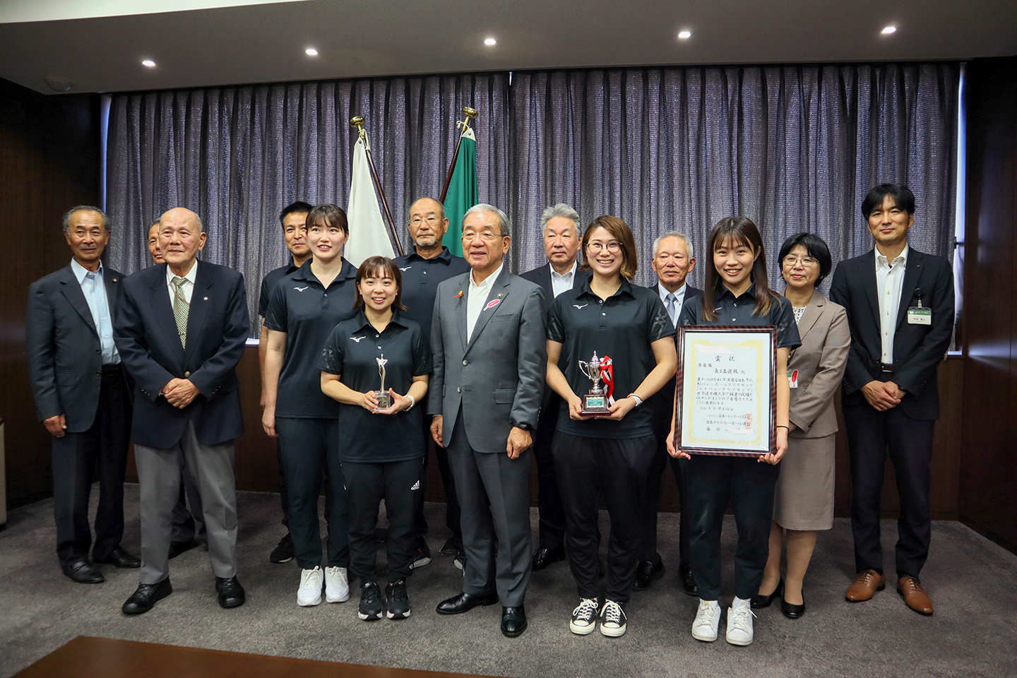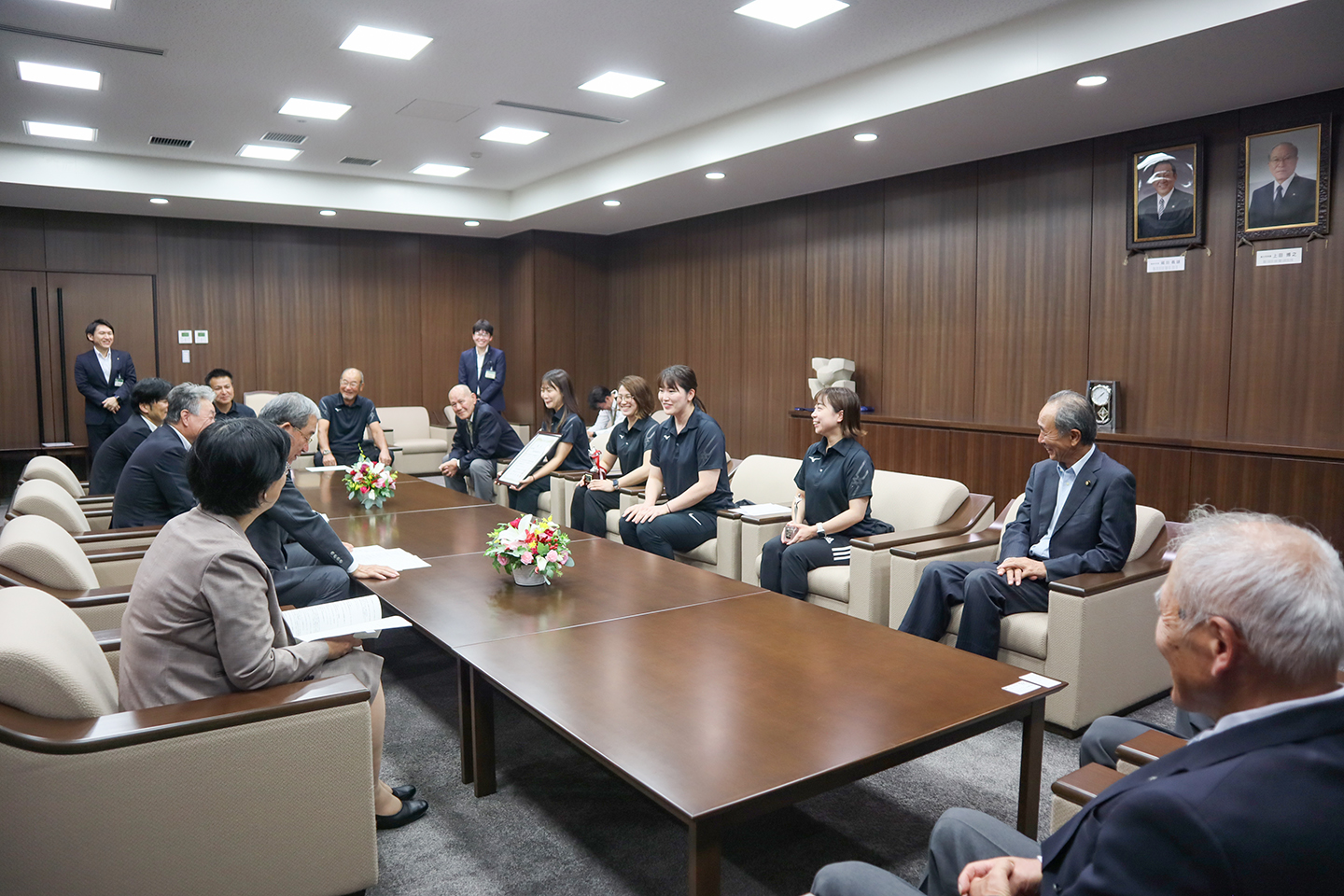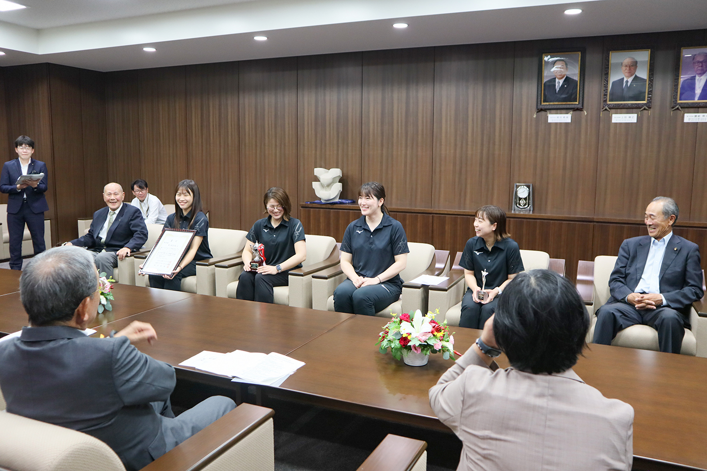 高垣市長らに準優勝を報告し、和やかに歓談する選手ら(撮影・山北)