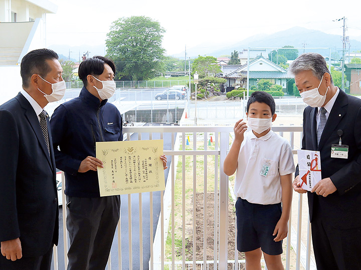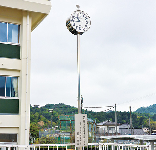 5月11日、同校で行われた寄付受納式には、5・6年生約90人が参加し、同市の市場一也教育長が牧尾社長に感謝状を手渡した。牧尾社長は「時間を大切に勉強や運動、遊びをしっかりして、学校生活を満喫してほしい」とあいさつ。児童を代表して6年生の三浦敦史君が「志和小・中学校の歴史を刻みつつ、みんなを見守ってくれる屋外時計。時間や屋外時計を大切にしていきます」と感謝の言葉を述べた。