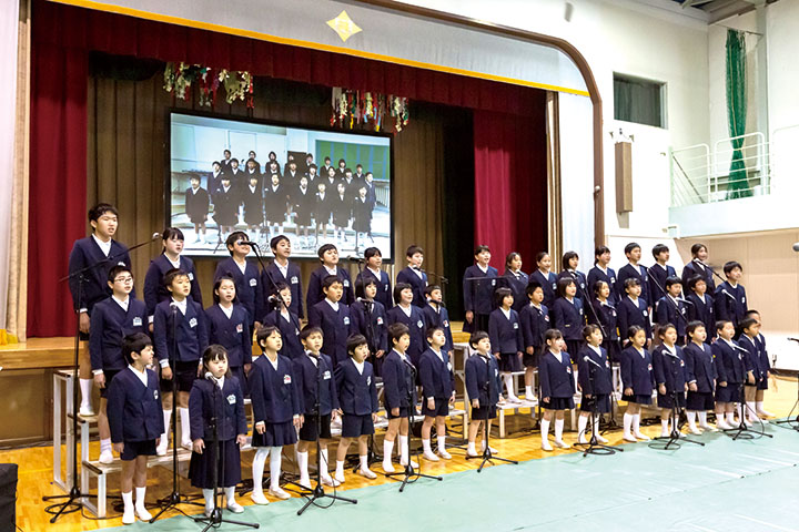 実証実験は、統合記念事業の一環として、東広島市とNTTドコモが実施。遠隔合唱を通して、5Gの実証実験と、両校児童の一体感の醸成を図ることが目的。