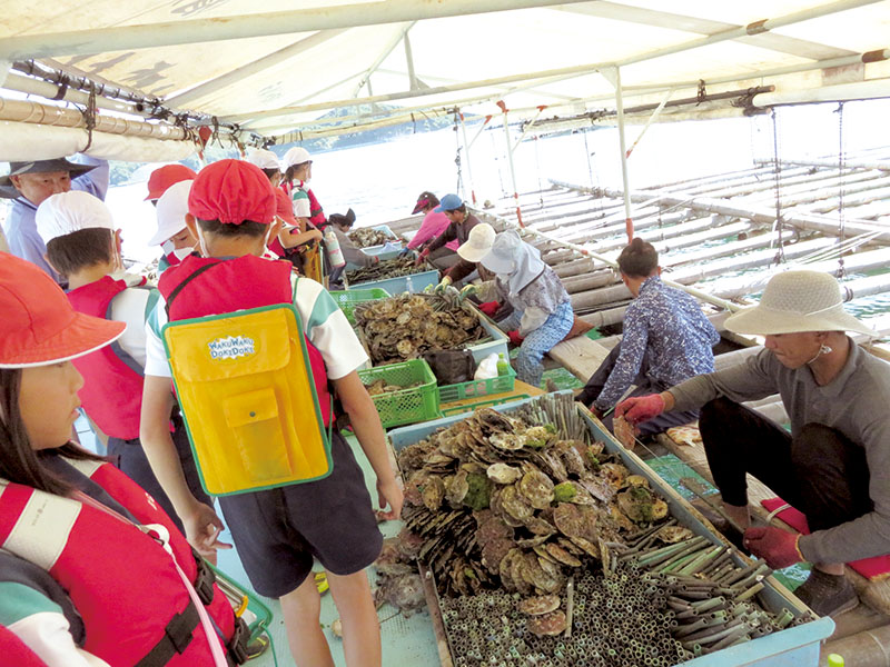 丸子東広島支社長と被災当時の様子などを振り返る児童
