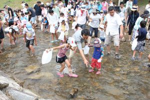 登立公園で福富川祭り 魚のつかみ取りに歓声