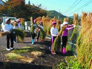 秋晴れの下元気に稲刈り 竹仁小学校