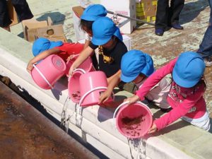 園児とオニオコゼ稚魚放流 安芸津漁協青年部
