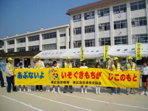 「あぶないよ いそぐきもちが じこのもと」 高屋西小学校で横断幕引き渡し式