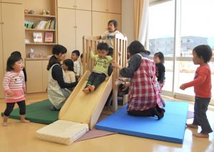 ぬくもりのすべり台に園児笑顔 ゆめタウン東広島テナント会が寄贈