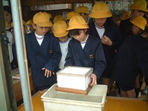竹原「竹の駅」で筆・竹和紙づくり 荘野小5年生21人が体験学習