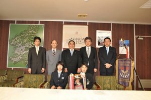 全国スポ少剣道交流大会で県チーム優勝 東広島の2人が市長に報告