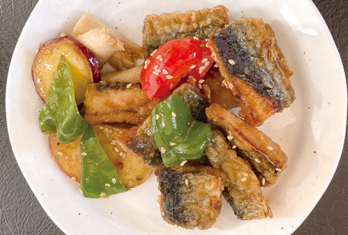 サンマを食べやすい大きさにカット。揚げた後に甘辛く味付け。彩りに加えたピーマンやゴマの風味もプラスされてご飯がすすむ😋。