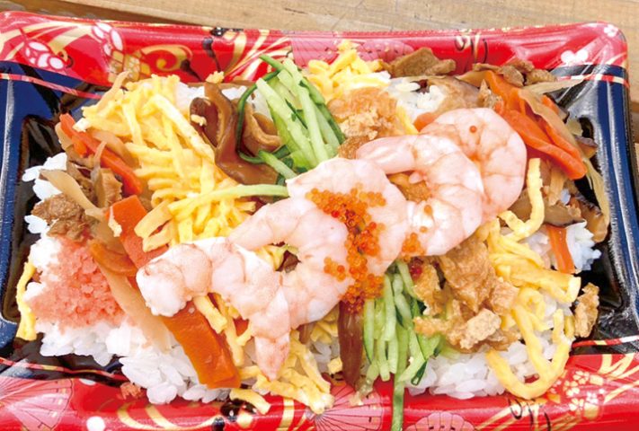 具材はニンジン、ゴボウ、シイタケなどを自社製の味付けに調理したものを使用。さらに黄色の錦糸卵、緑色のキュウリ、赤色のエビで盛り付け。