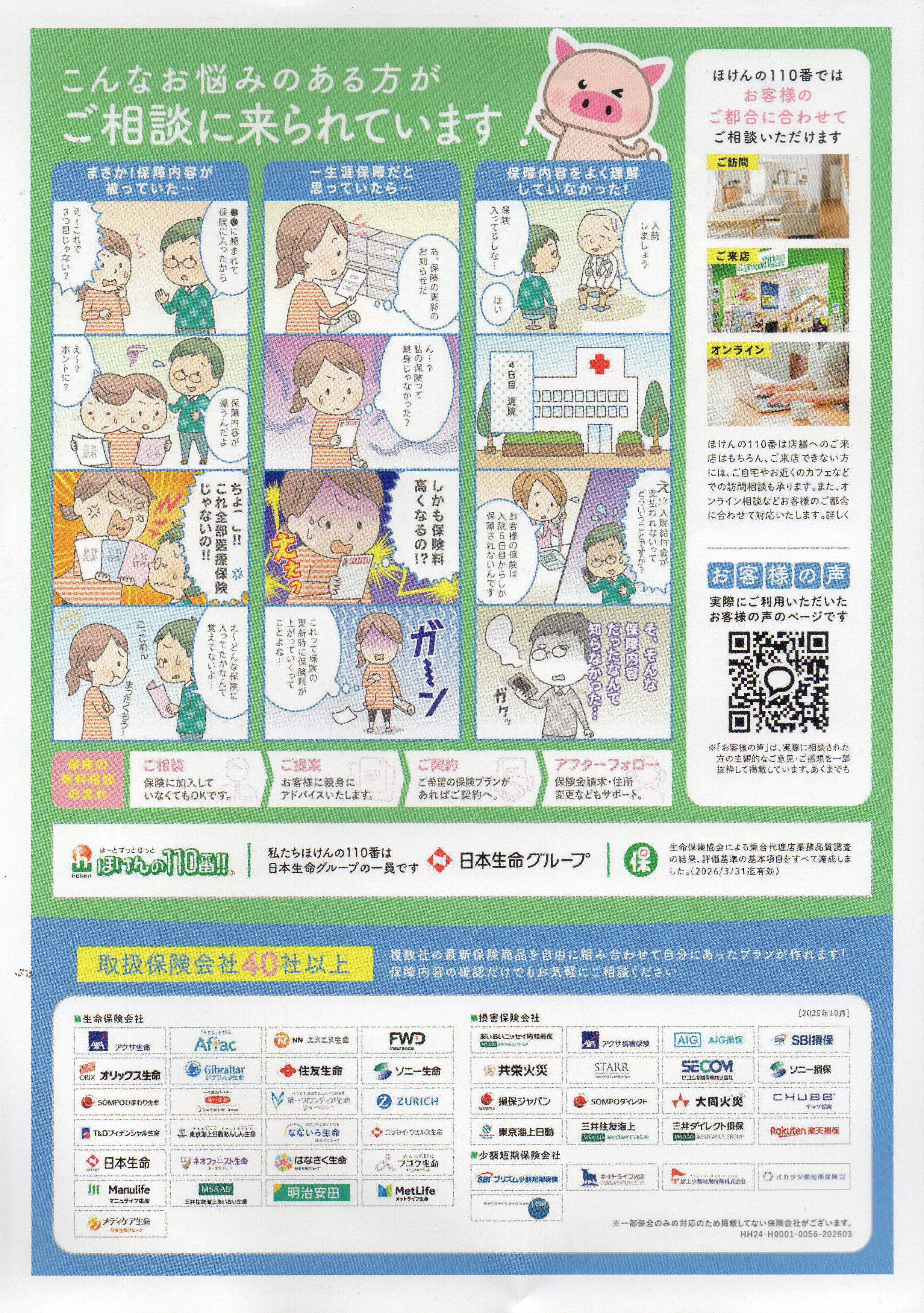 40社以上から比較でき、保険の見直しや相談を無料で受けられます。来店のほか自宅やオンラインにも対応。相談者には生活用品のプレゼントもあり、気軽に相談できます。