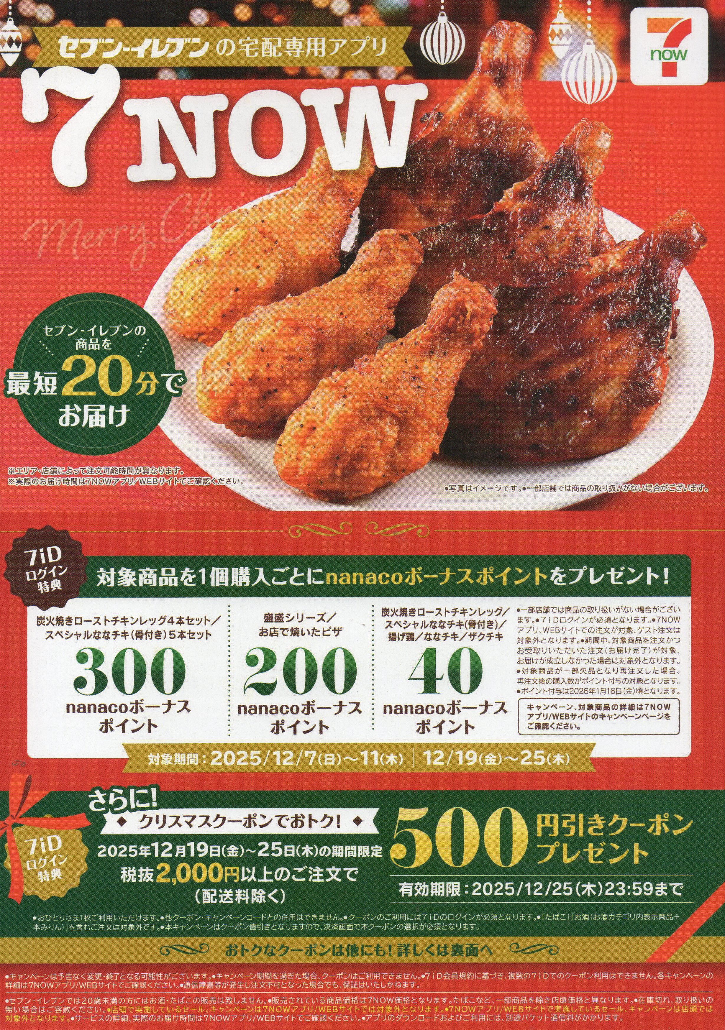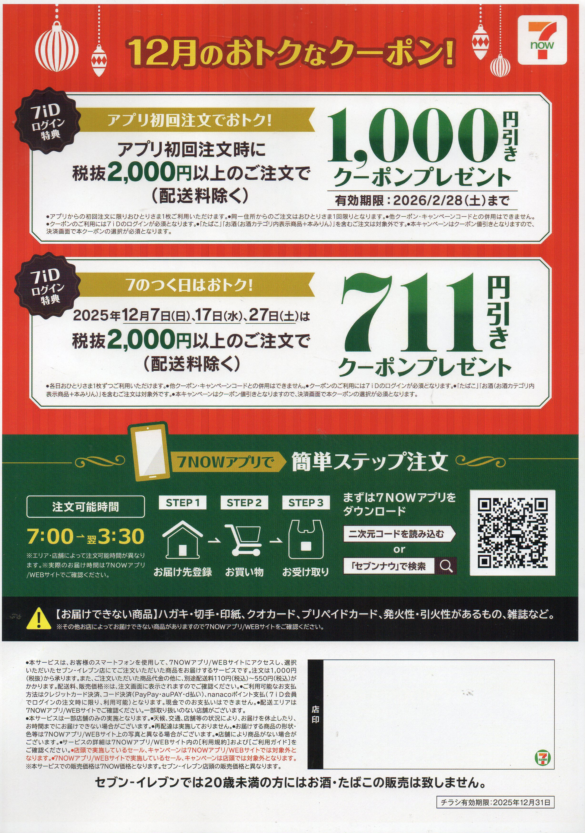 宅配アプリ7NOWでは、対象商品の購入でポイントが貯まる特典を実施中です。クリスマスクーポンや初回注文割引など特典が多く、最短20分で商品を届けます。忙しい時期の買い物に便利なサービスです。