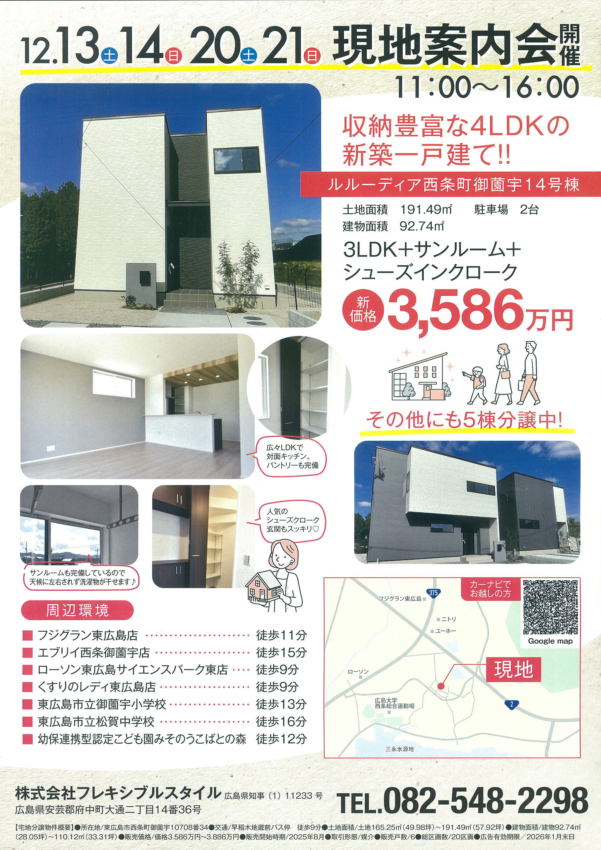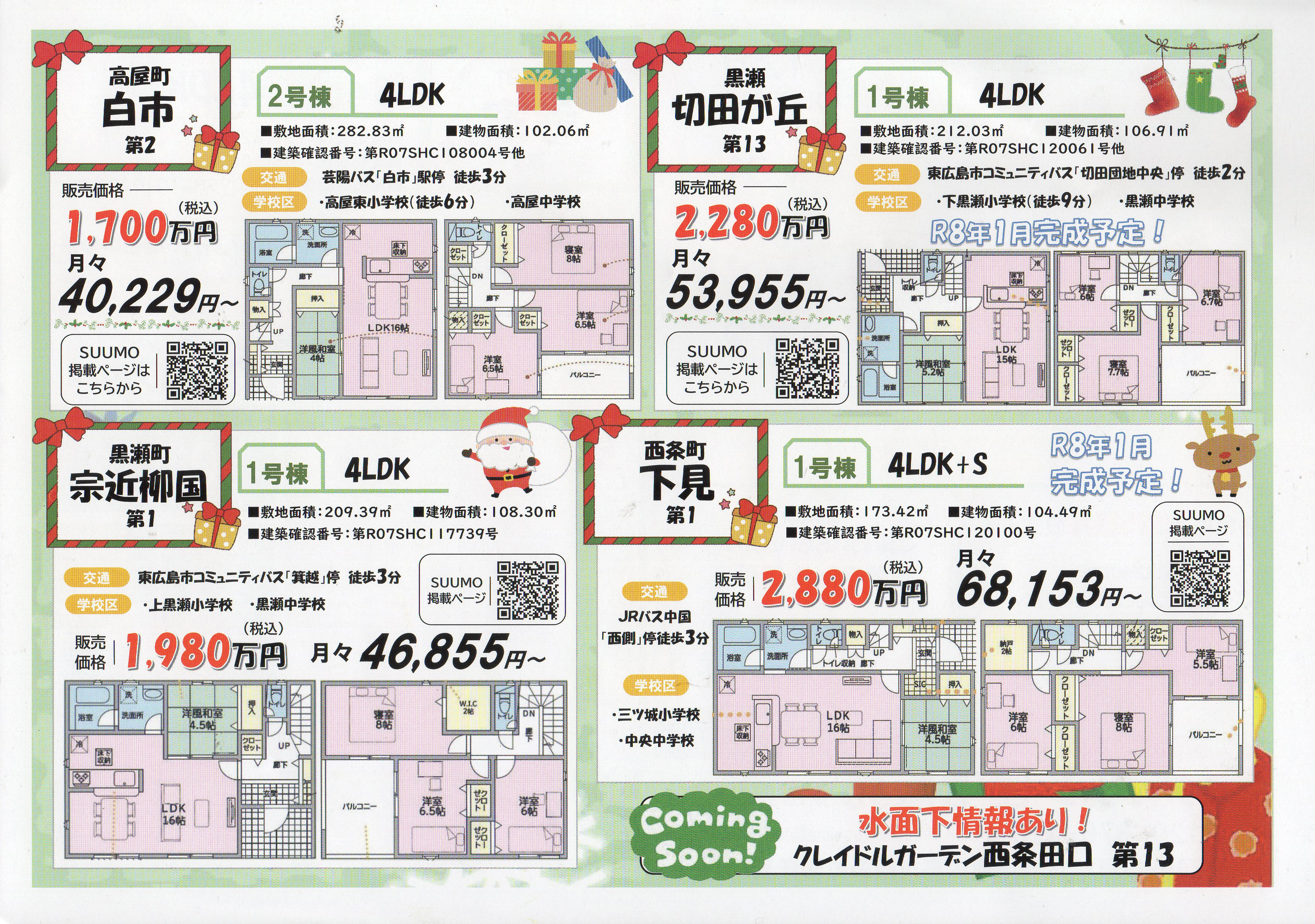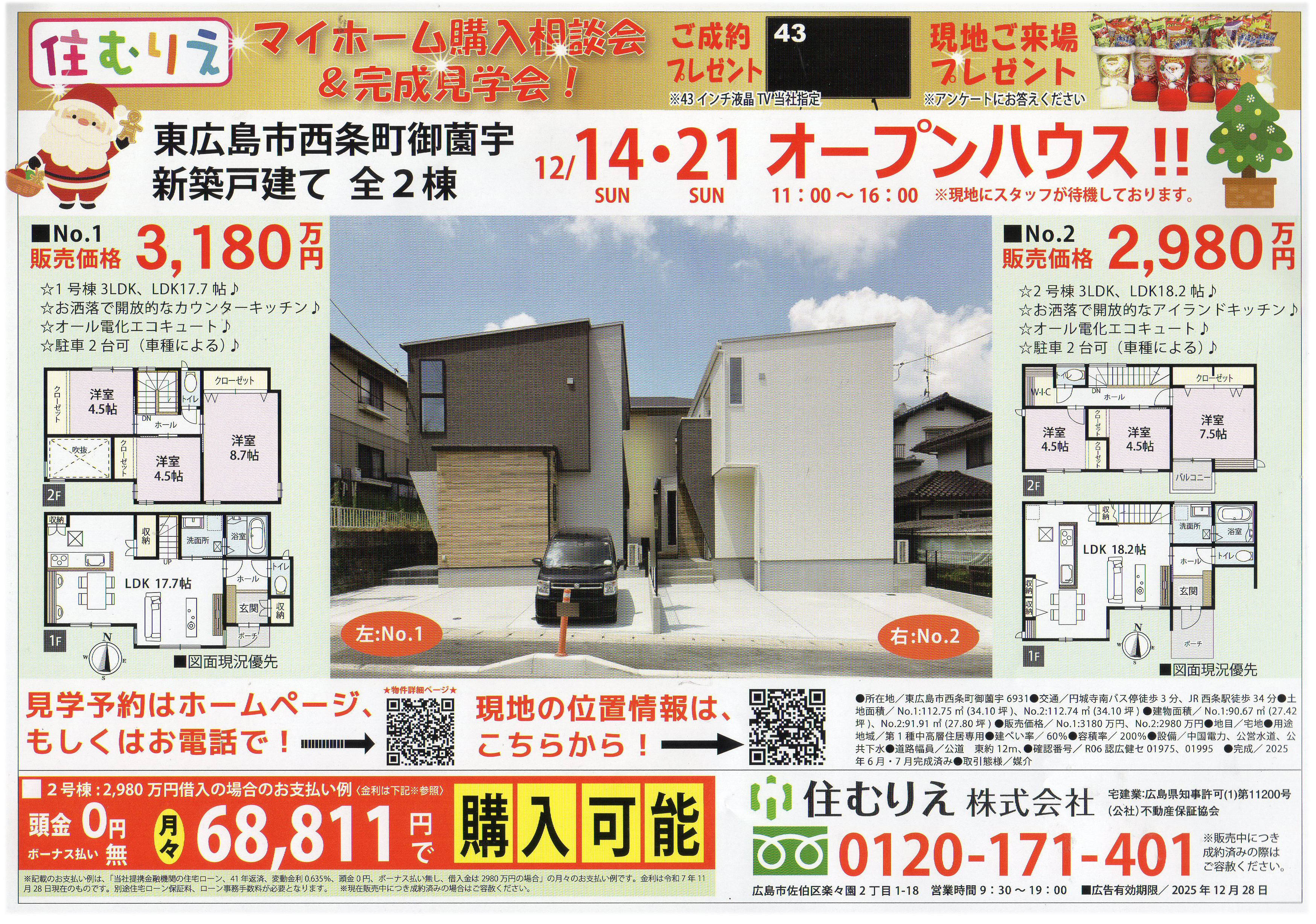 全2棟の新築戸建てが完成し、12月14日と21日に公開します。広々とした3LDKや明るいLDKが魅力で、月々の支払いも無理のないプランです。来場特典もあり、住まい探しに最適です。