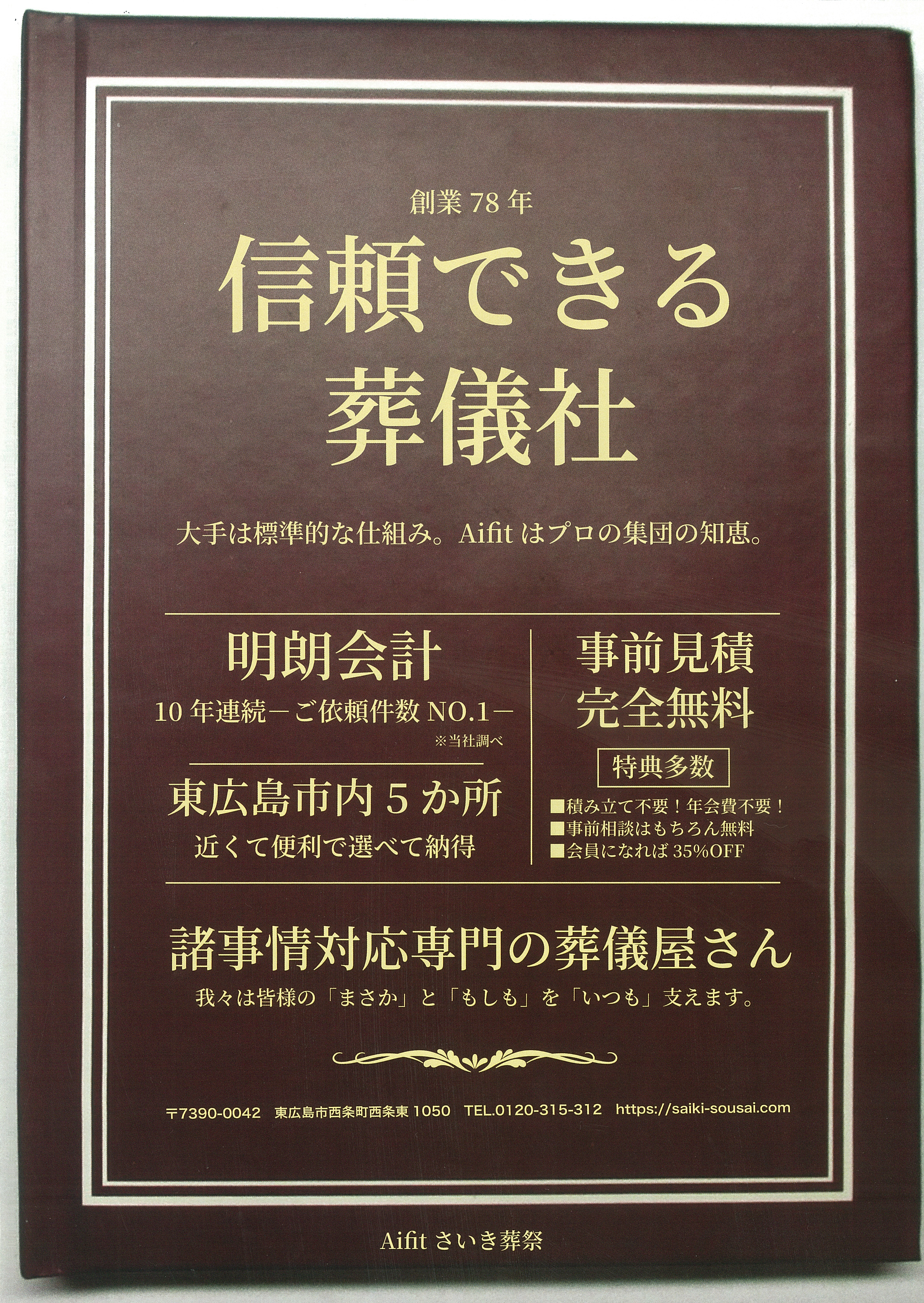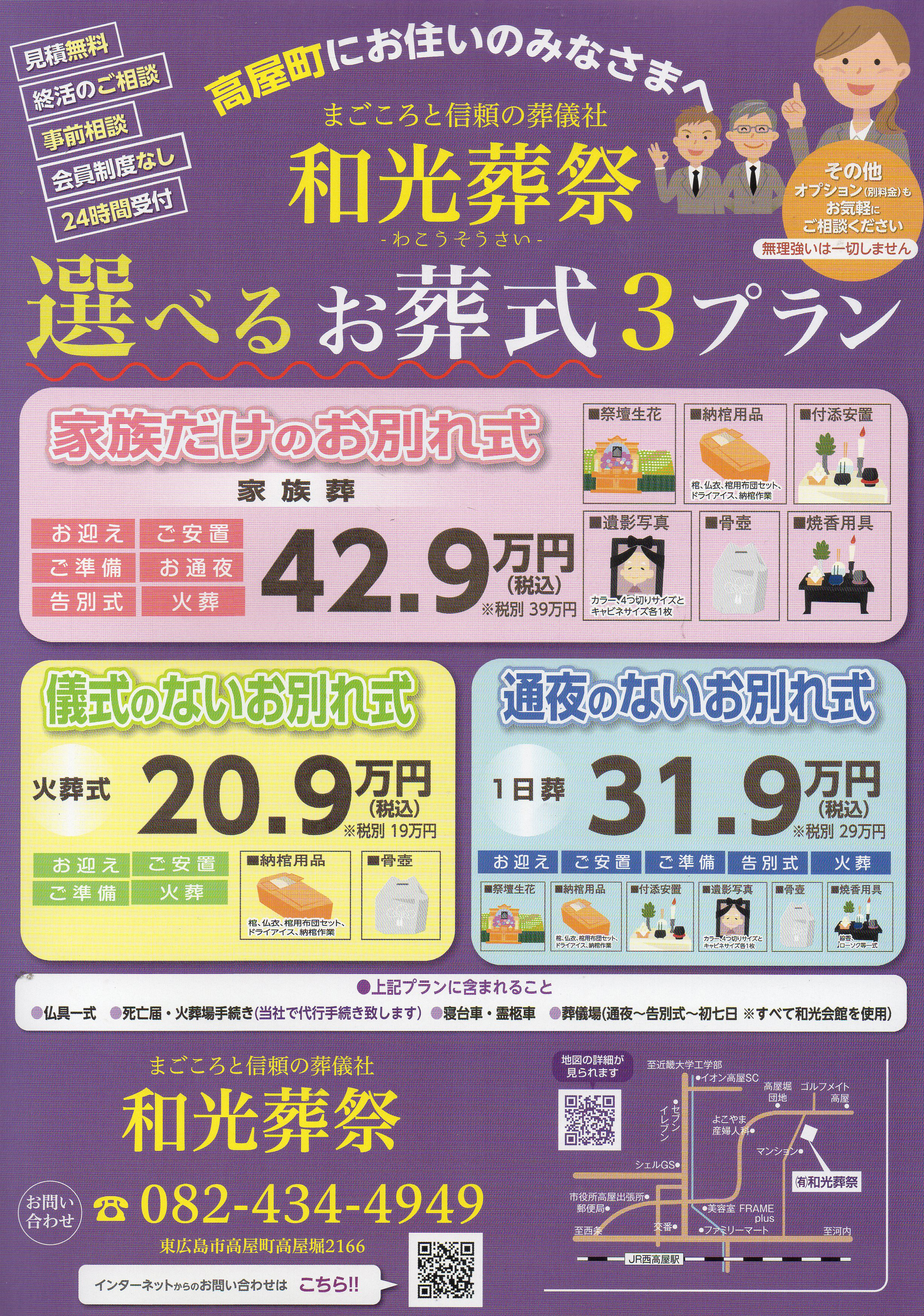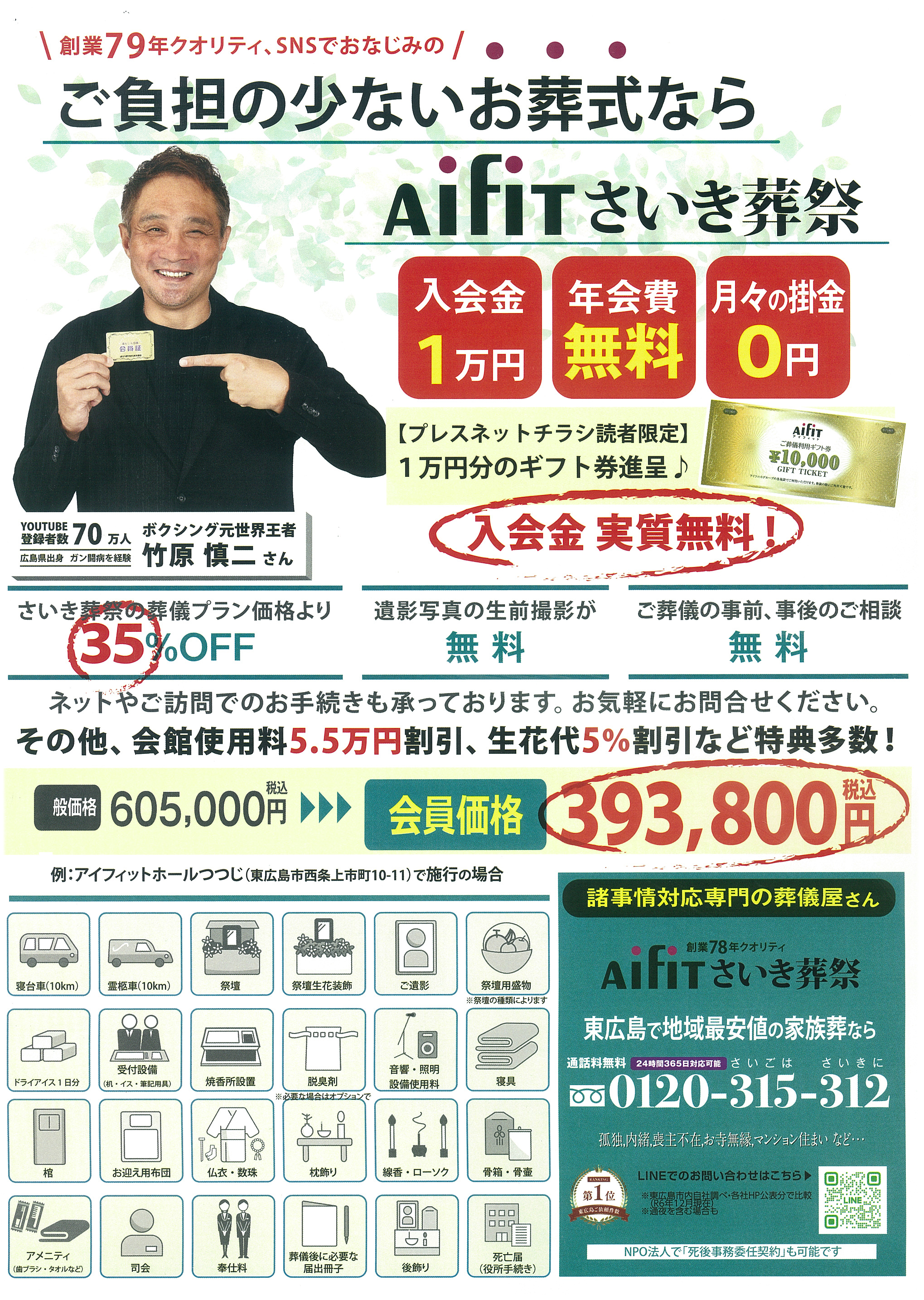 入会金のみで会員になれ、葬儀プランが35%オフになります。読者限定でギフト券進呈もあり、会館使用料割引など特典が多数。東広島市内5会館で24時間体制の安心サポートを行っています。