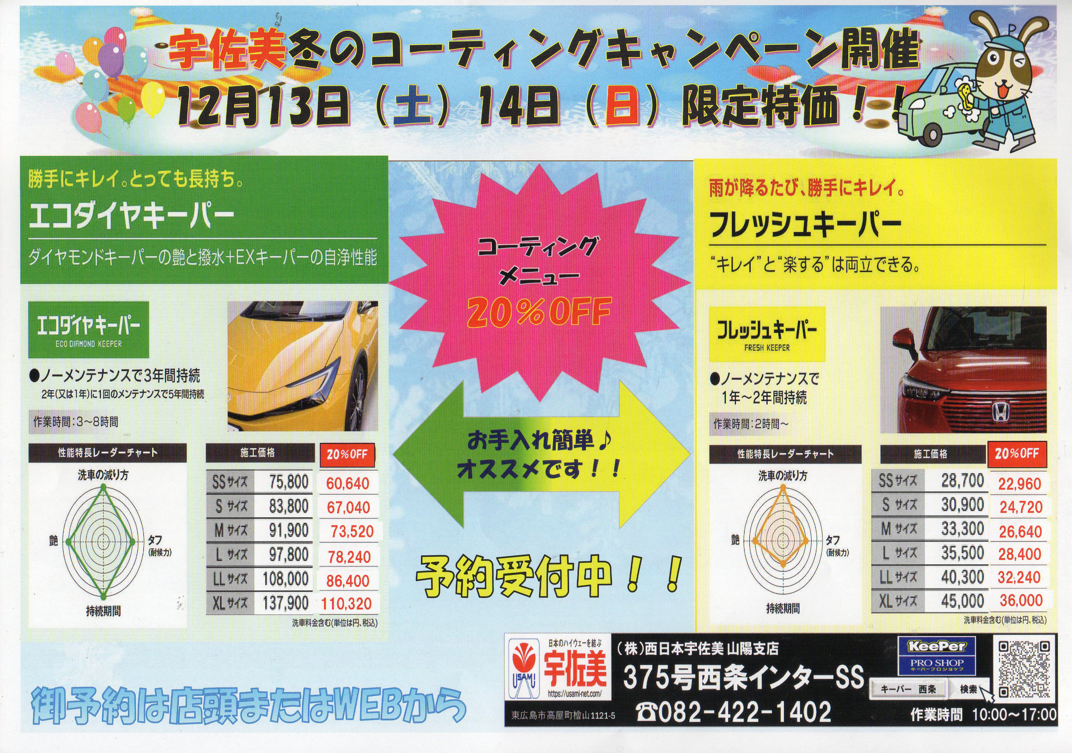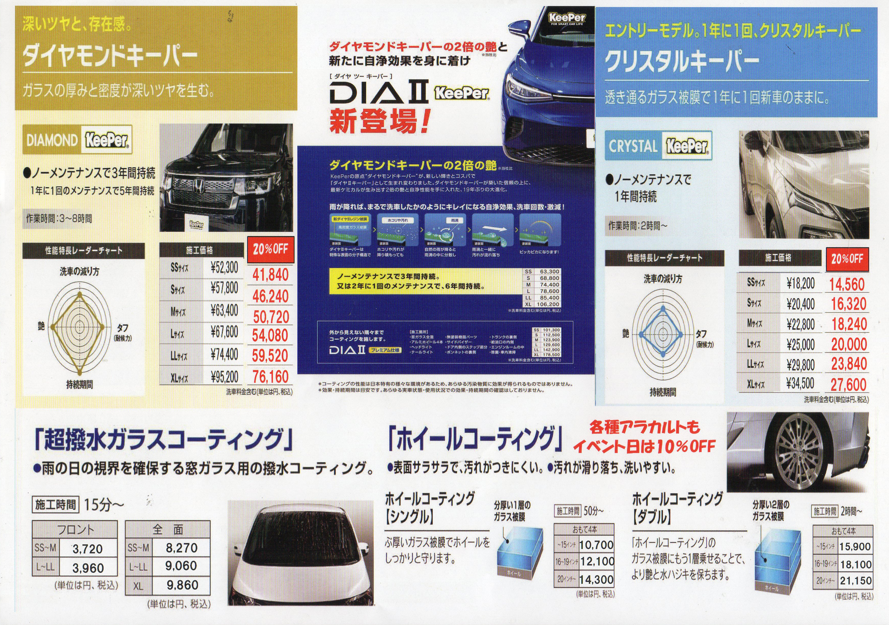 12月13日・14日の2日間、人気のカーコーティングが20%オフで利用できます。車種別料金も分かりやすく、ガラス撥水など単品メニューも対象。冬のメンテナンスにおすすめです。