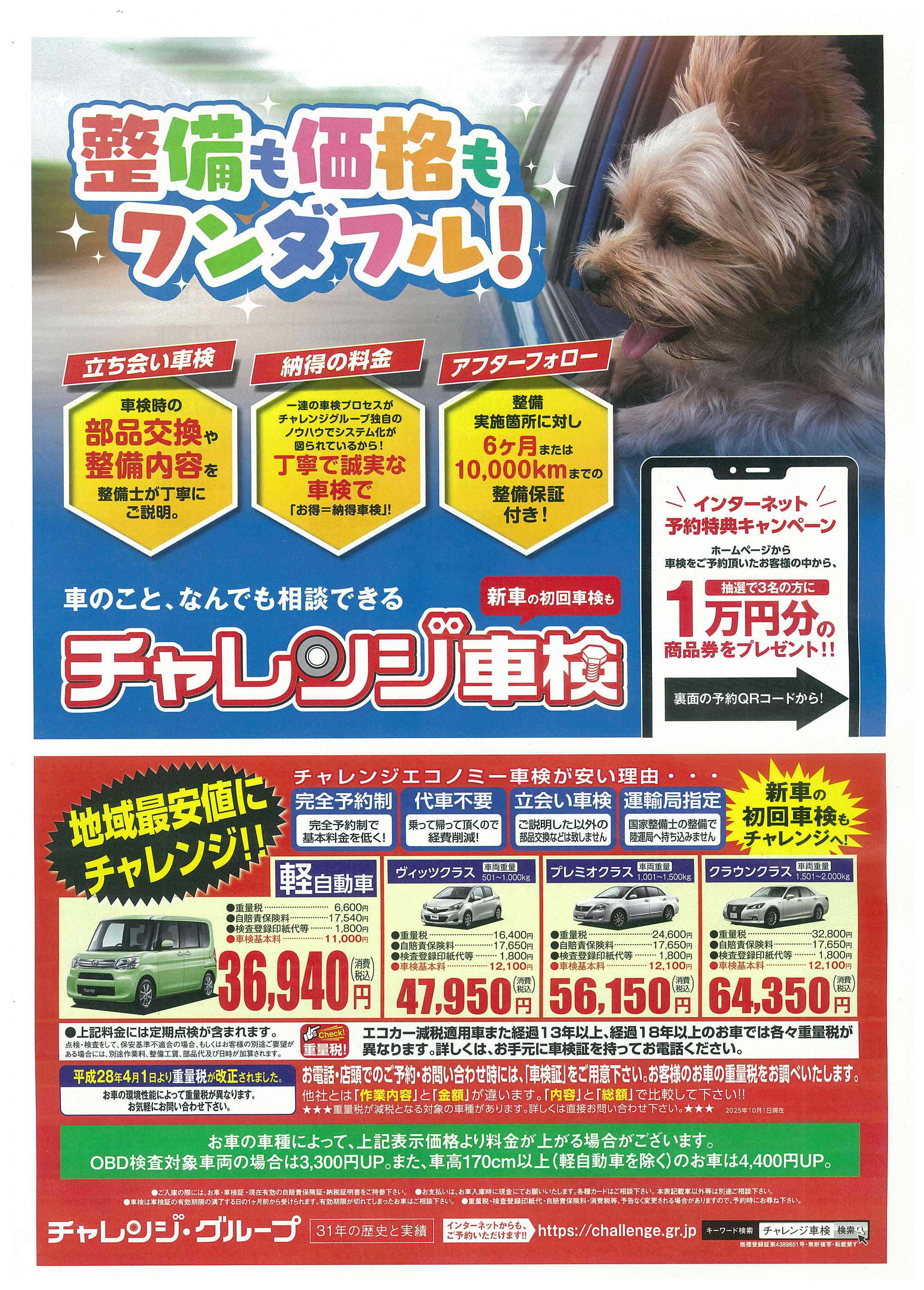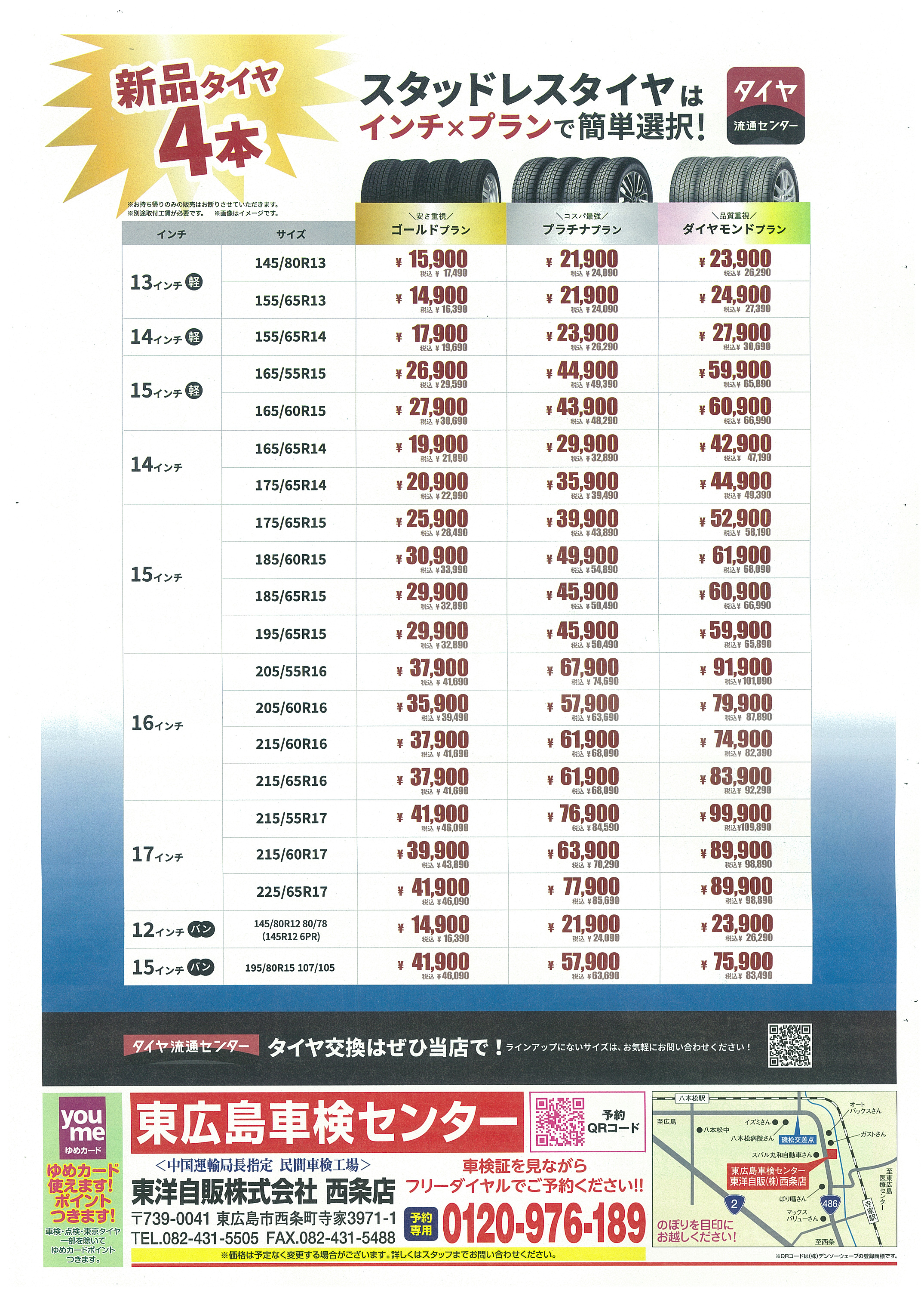 立ち会い説明で安心の車検を提供しています。6か月または1万キロ保証付きで、ネット予約の特典もあります。スタッドレスタイヤも多数そろえ、車検と同時の交換も便利です。