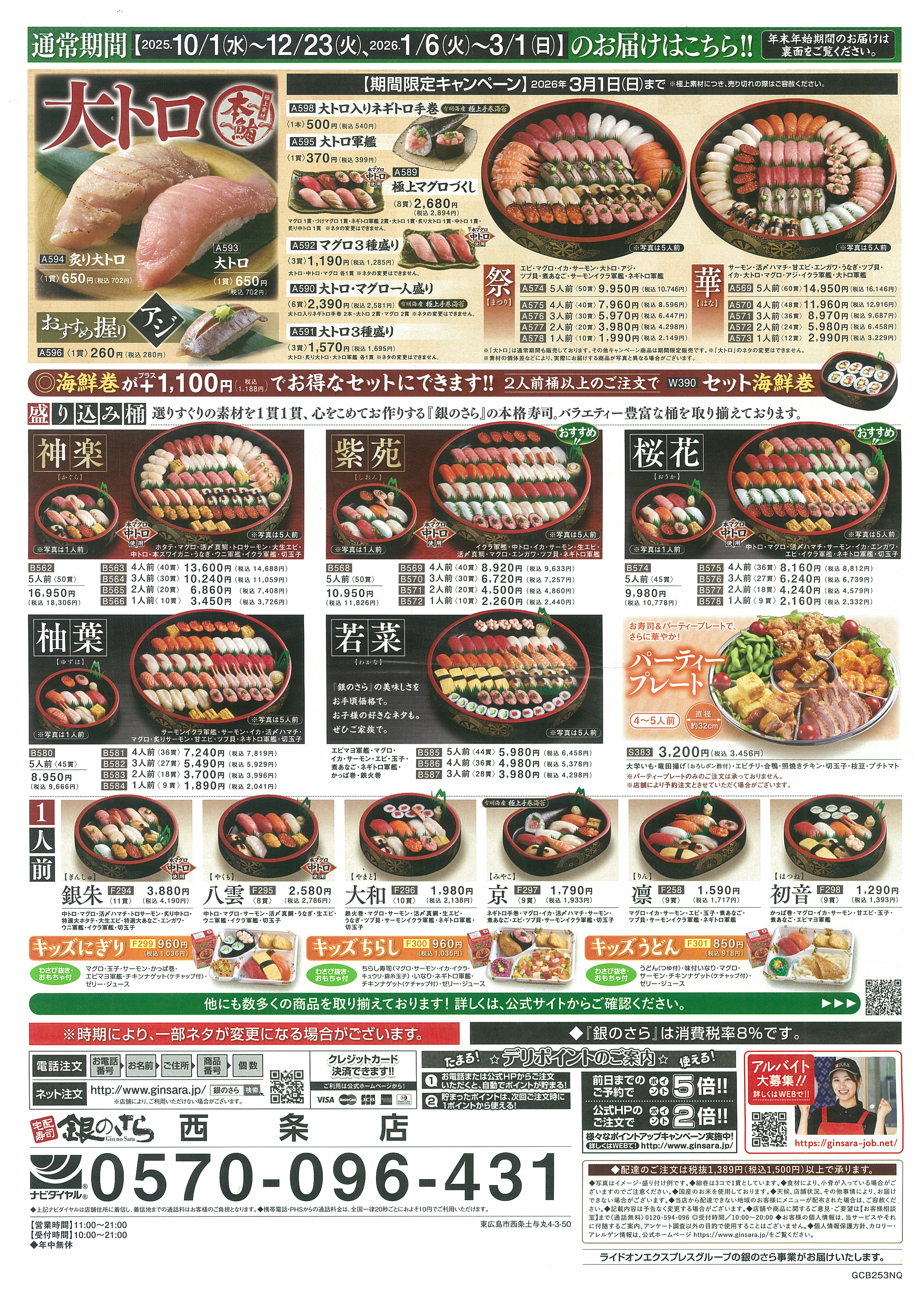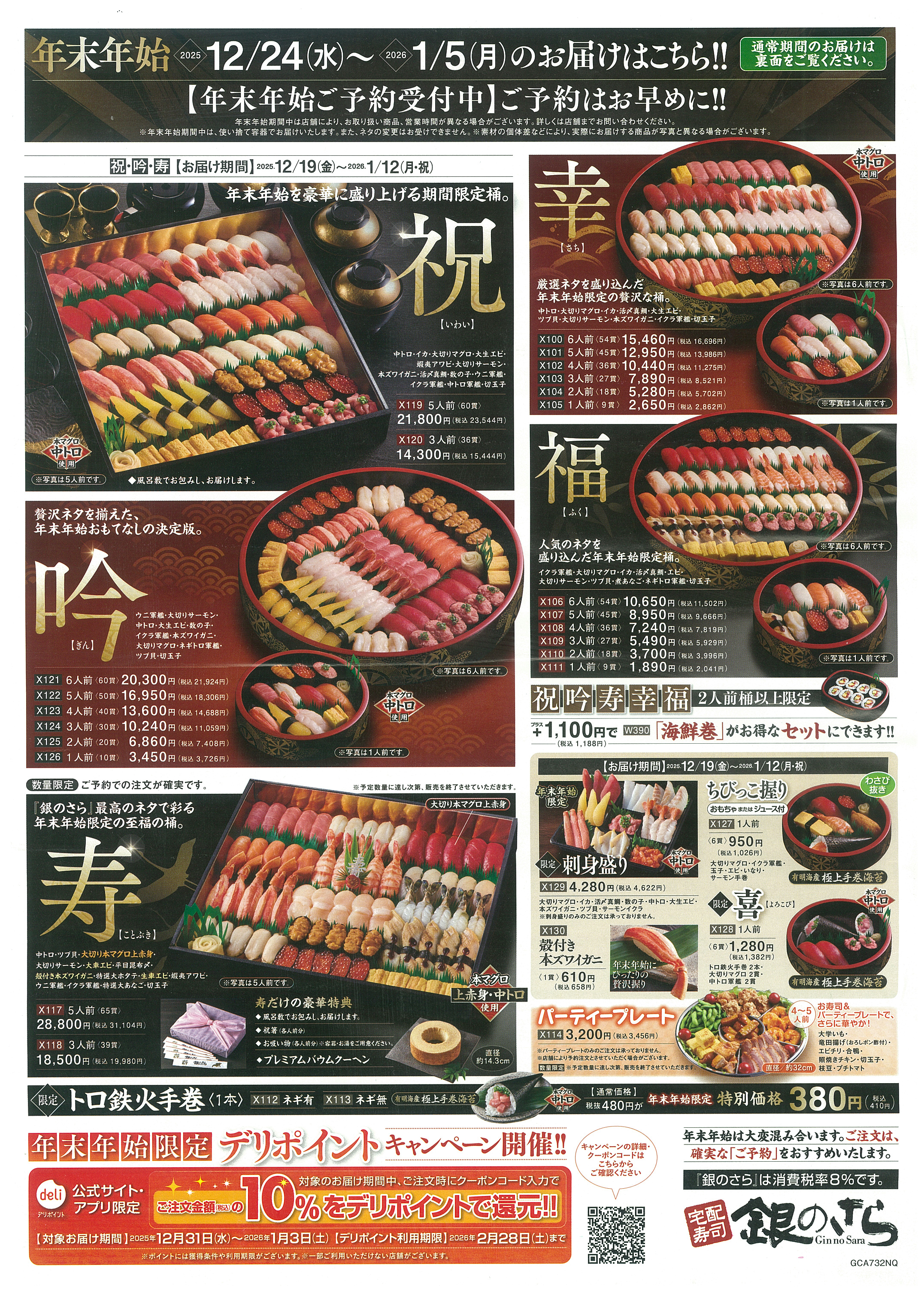 年末年始限定で特別メニューをご用意しています。華やかな盛り込み寿司やセット、キッズ向けなど種類豊富にそろえています。海鮮巻が追加できるお得なセットもあり、季節の集まりにおすすめです。