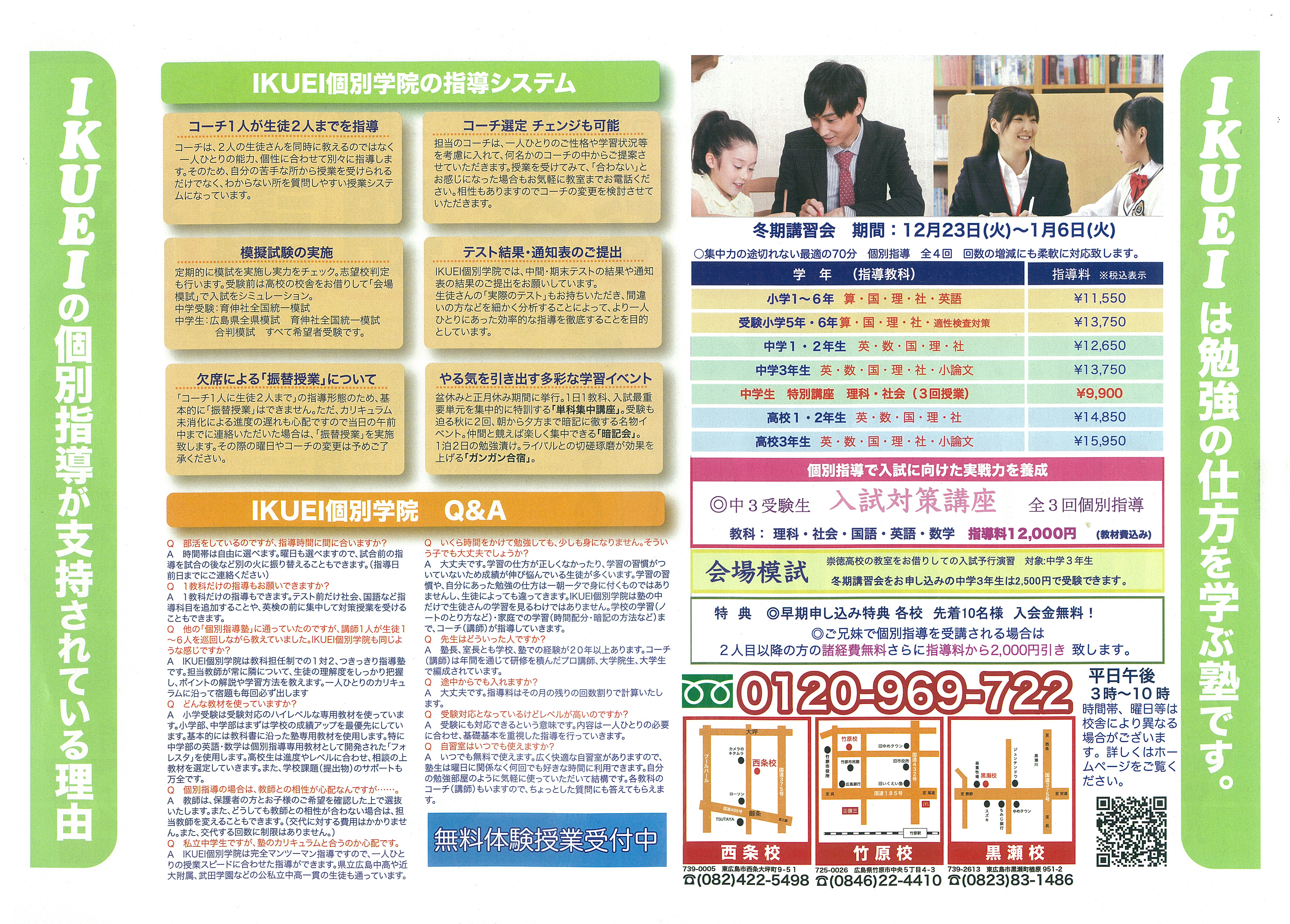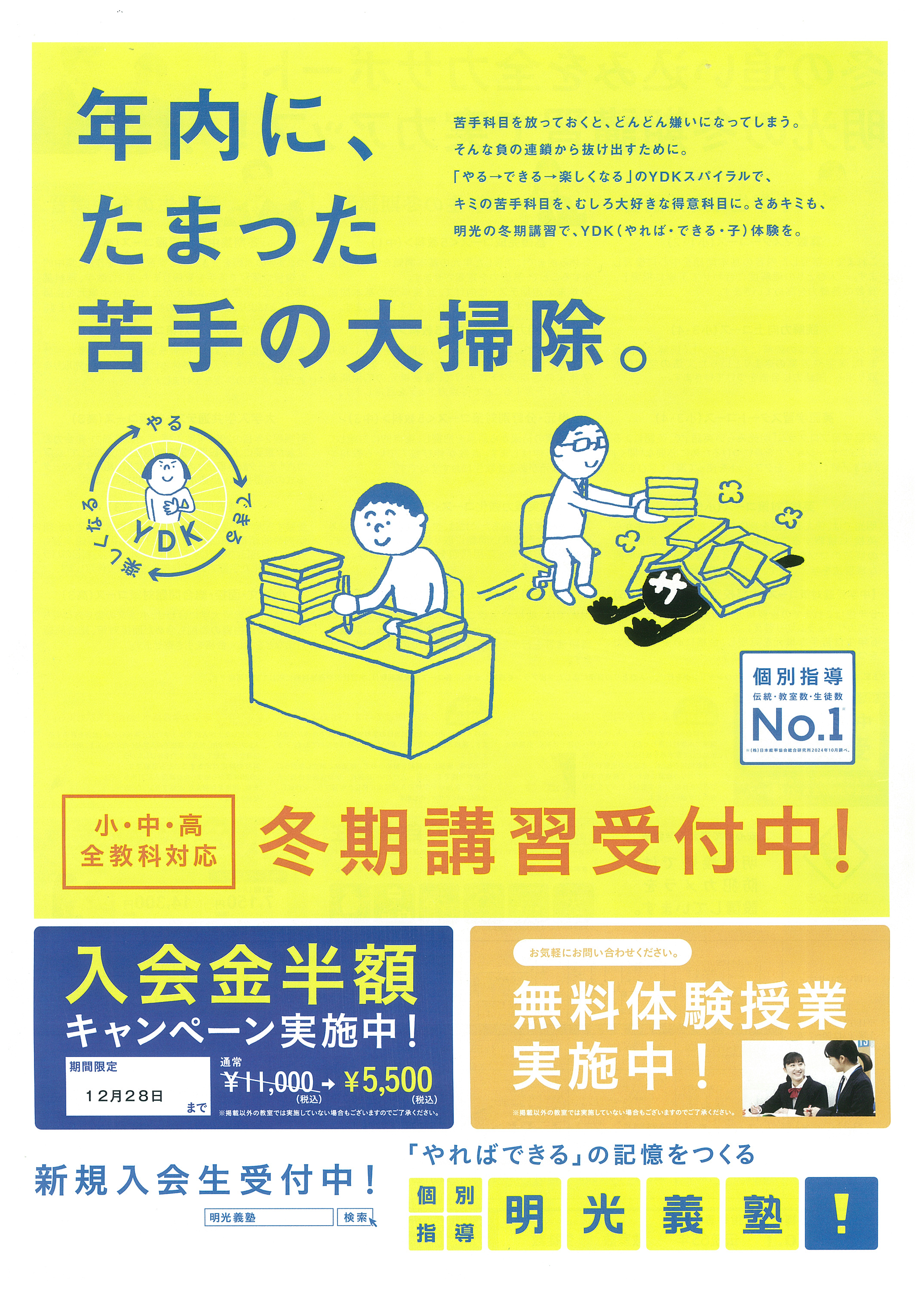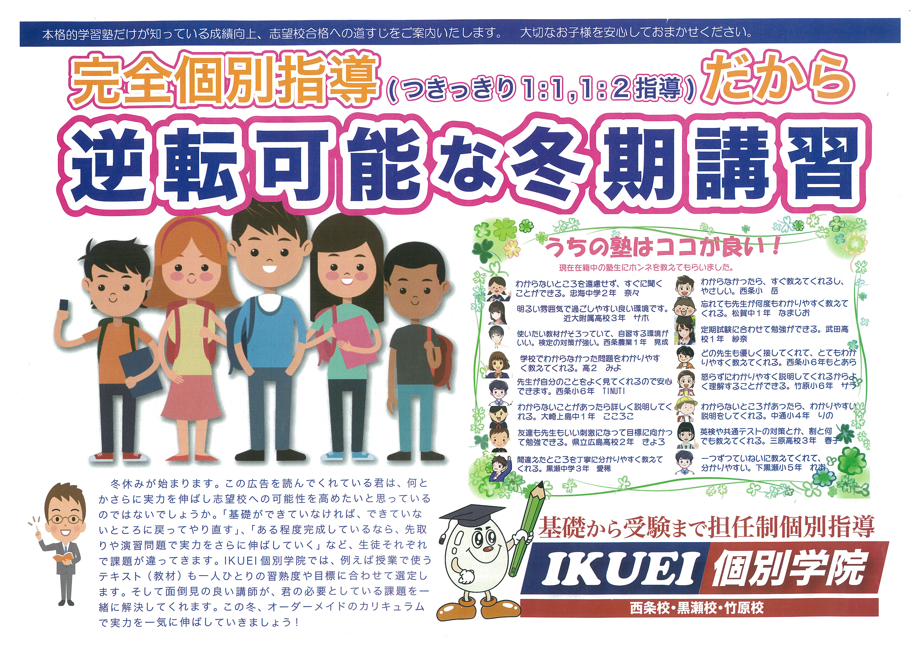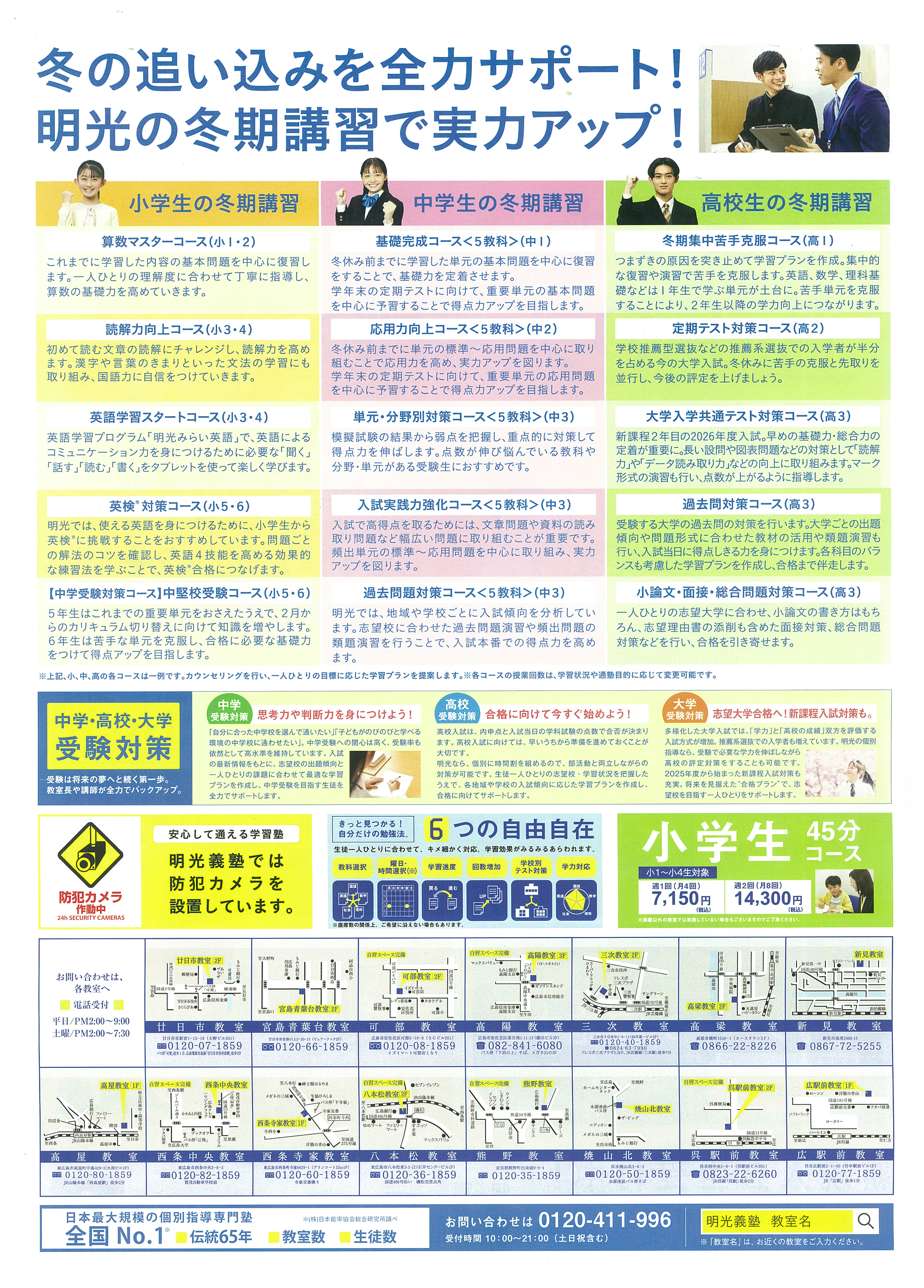1対1・1対2の個別指導による冬期講習を実施します。小学生から高校生まで目的に合わせて選べる講座を用意。無料体験も受付しており、冬の学力アップに最適な環境が整っています。