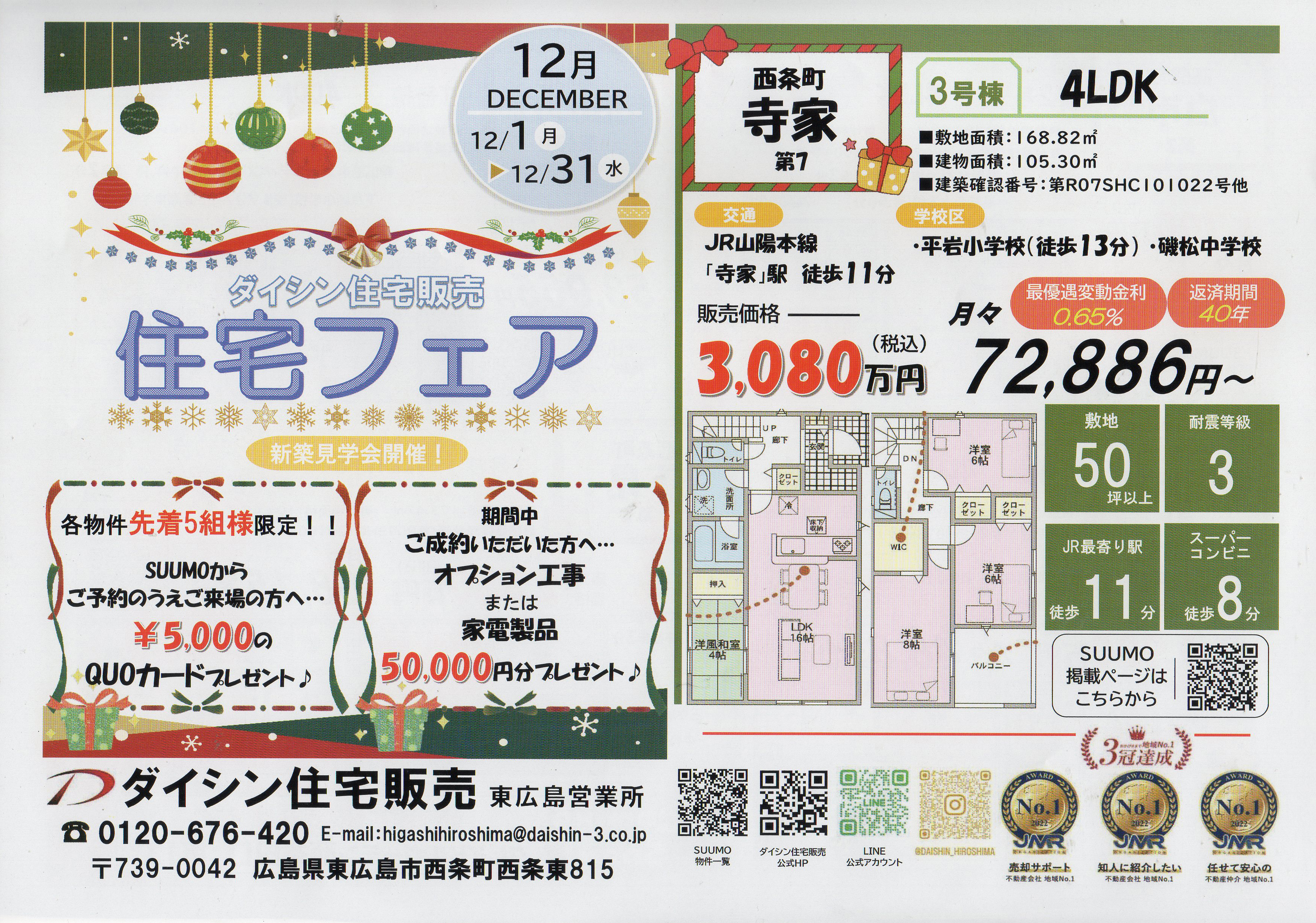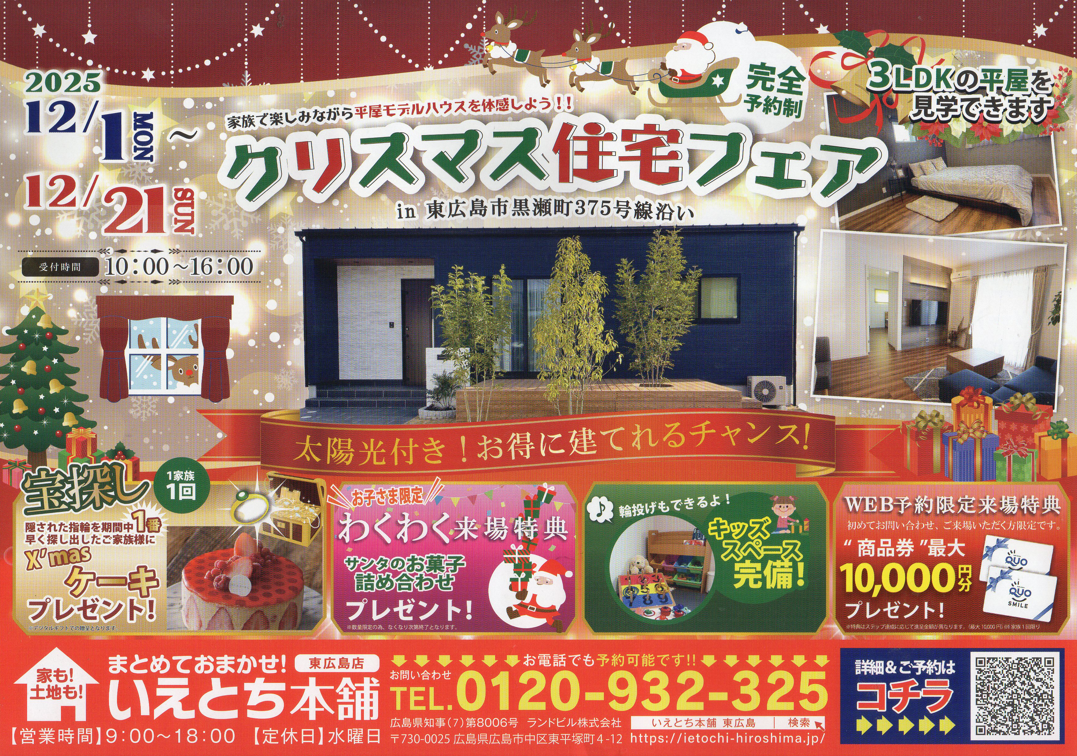 12月いっぱい住宅フェアを開催し、東広島エリアの新築を多数紹介します。成約特典や予約来場特典も用意。年内に住まいを検討中の方に最適なイベントです。